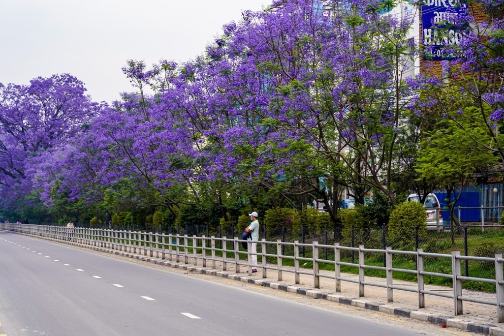 Jacarandas line the streets of Kathmandu with their purple flowers, brightening up the city in spring and summer. Rhododendron arboreum, or tree rhododendrons, are the national flower of Nepal, with their red, white, and pink flowers in bloom across the Kathmandu Valley between March and late April. Tree rhododendrons are endemic to Nepal.