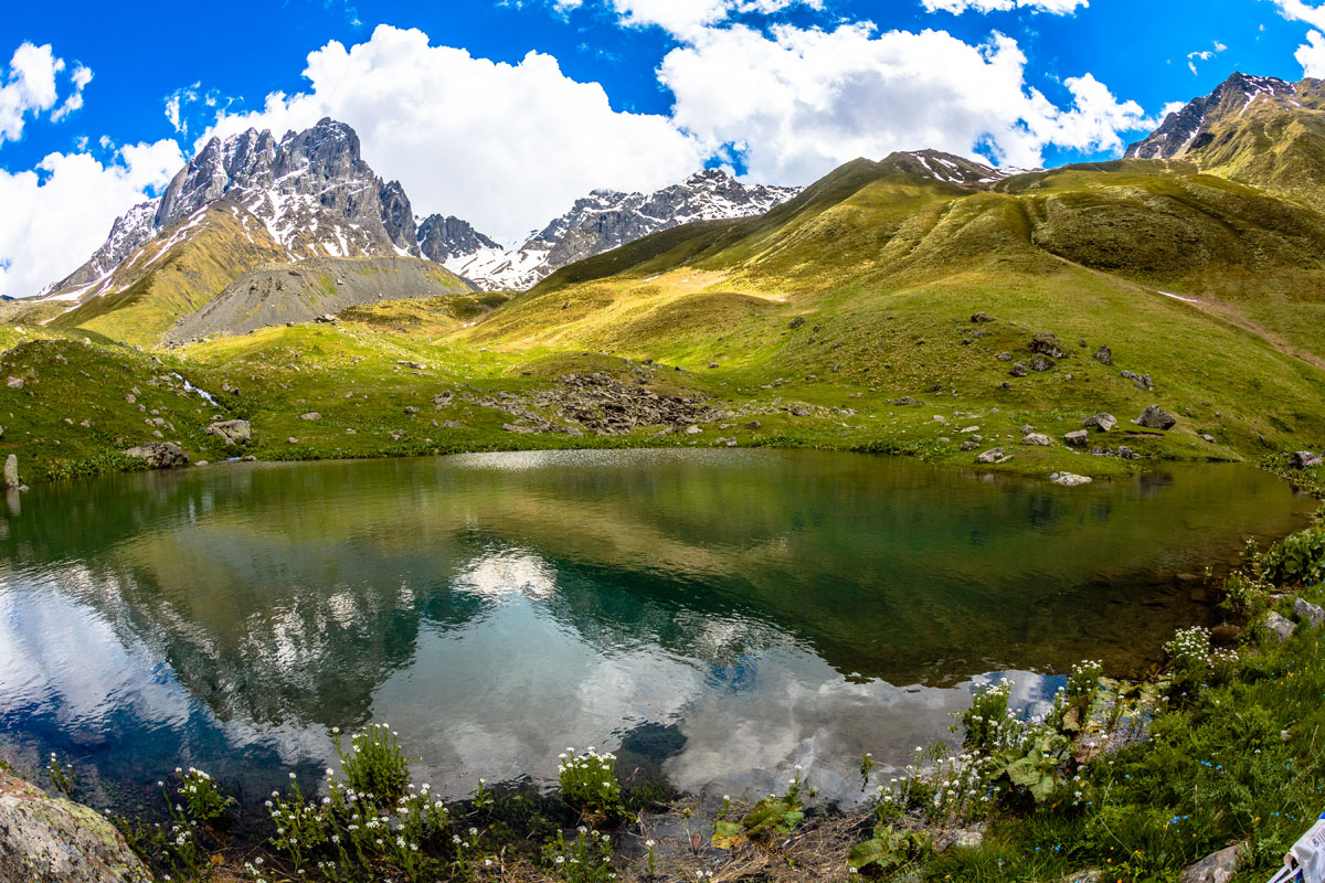 The lake is a popular resting spot for trekkers continuing over the Chaukhi Pass and day hikers terminating their hike at the lake. There is also a campsite located here. From this vantage point you will also see some hikers who are starting one of two potential continuations of the trail; the 9-hour Chaukhi Pass day hike, with an additional 1,000 m of elevation gain over a few hundred meters, and the Chaukhi to Roshka Trek going fully through the pass and ending in the village of Roshka and taking about a day or two.