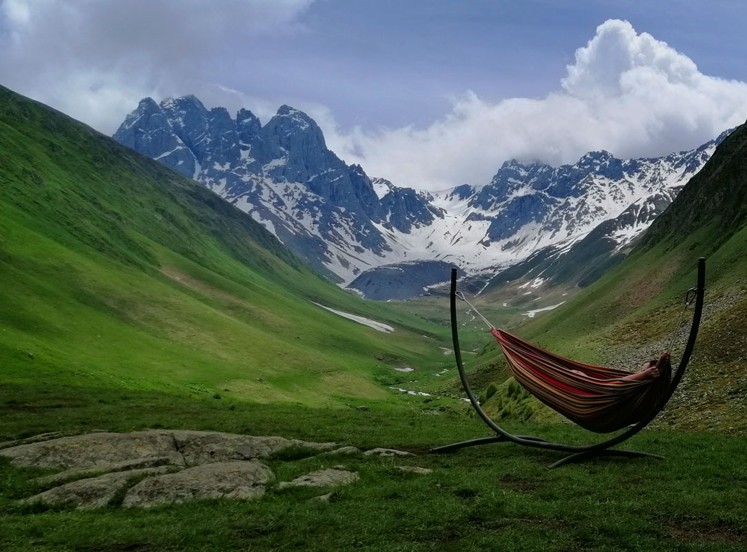 The Chaukhi Massif, also known as the Georgian Dolomites is a seven spiked massif that opens up to a beautiful valley cut with mountain snow melt rivers and a variety of interesting rock formations.
