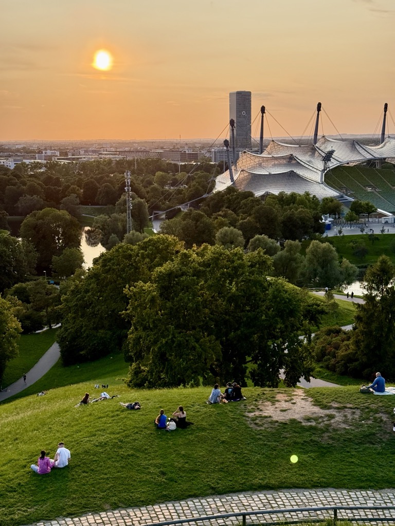 Munich’s Olympiapark was created for the 1972 Summer Olympics. Its elevation is derived from rubble mounds left from World War II bombings. Today, it covers about 85 hectares, about a quarter of the size of the Englischer Garten.