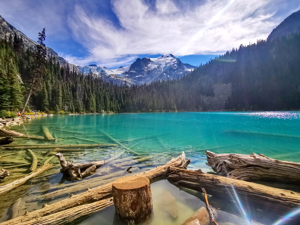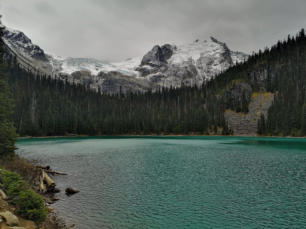 It’s a vibrant place to stop for a snack or lunch and watch tourists trying to snap the perfect shot standing on Joffre’s iconic floating log. People always fall in; it’s prime entertainment and worth stopping for a show. As we rested, the local Whiskey Jacks eagerly approached, on the lookout for snacks from unsuspecting visitors. Be warned, these cute little tricksters have stolen food right from my plate.
