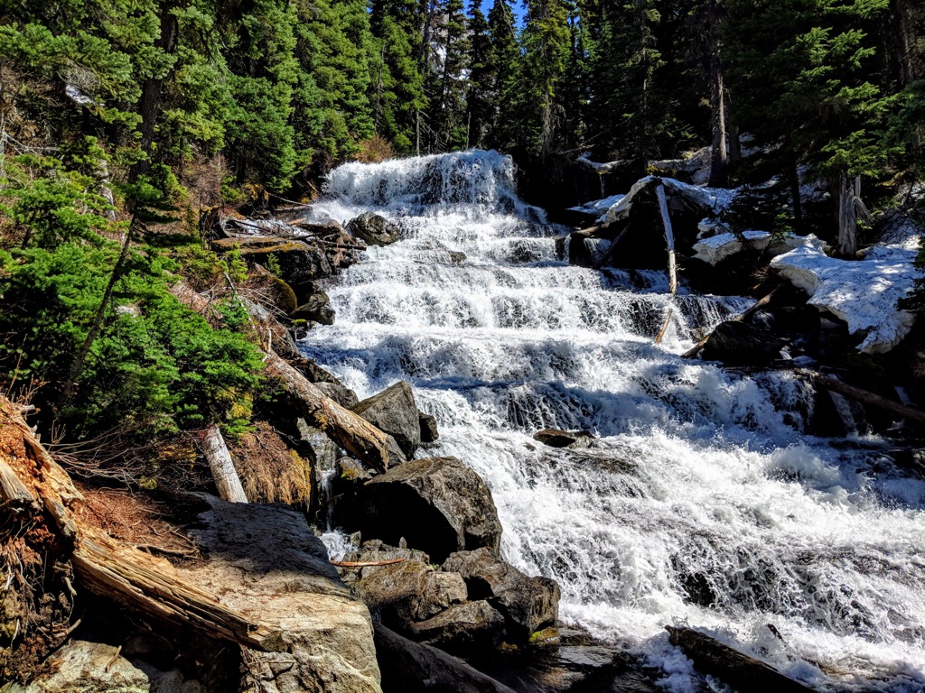 Holloway Falls eventually comes into view. Although a small waterfall, a torrent of whitewater emerges from the old growth and crashes under an old bridge—the perfect spot to fill up your water filter bottles and continue onwards. The trees begin to thin as you enter the alpine bowl where the final lake sits.