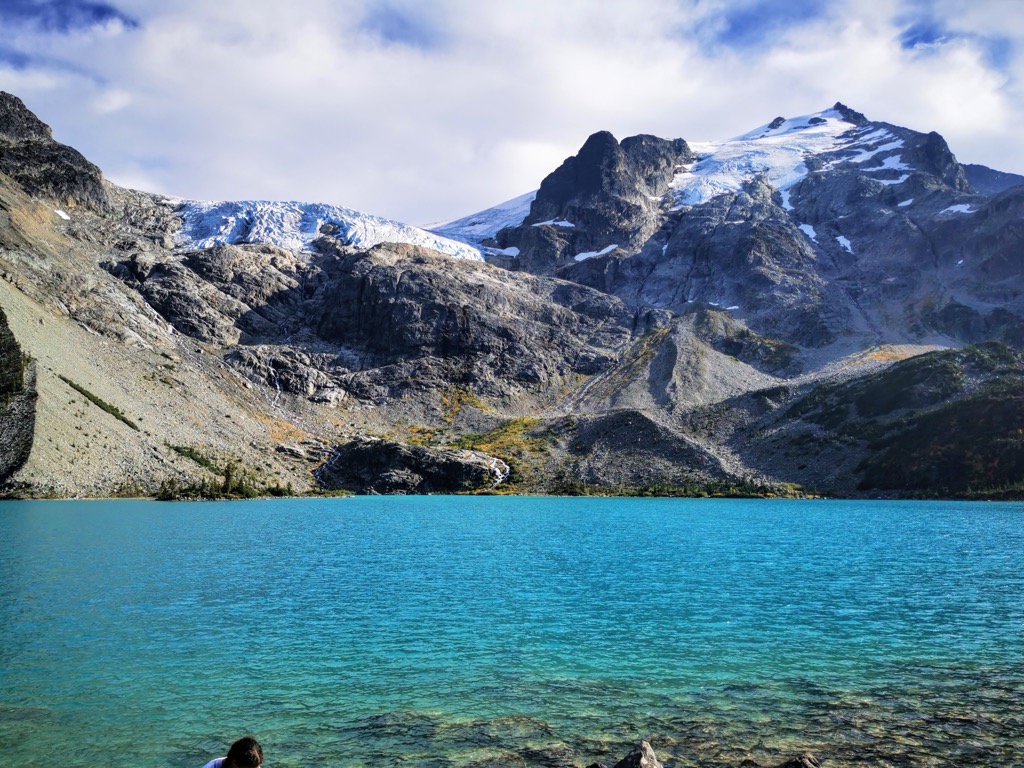 Dark teal waters reflect the rugged ridgelines of Joffre Peak and the two-million-year-old Matier Glacier in the distance. The trail disappears in spots where you’ll navigate the rocky shore in search of the 26 camping pads on the far side of the lake.