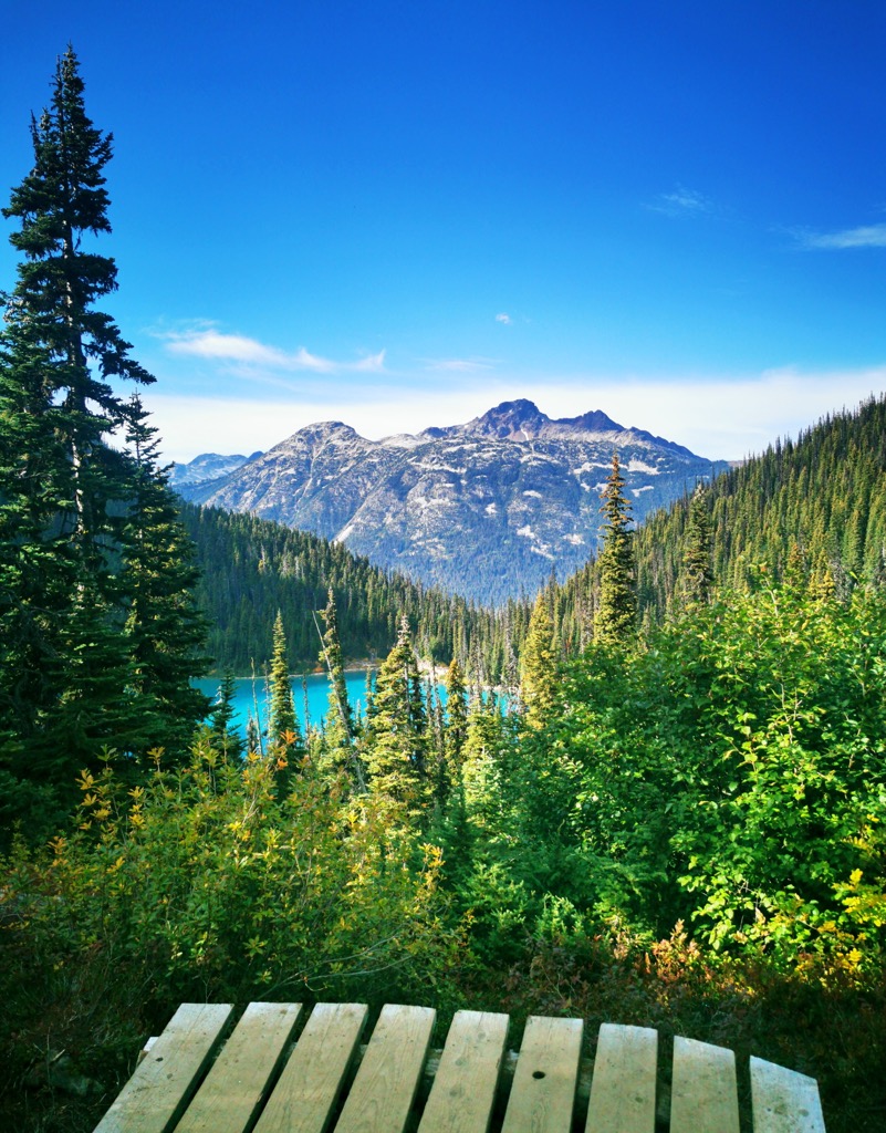 Under a canopy of vegetation, the trail straightens out, and you get your first glimpse of the second lake. In my opinion, Middle Joffre Lake is the most beautiful. The rich turquoise waters are electrifying to behold. With the backdrop of Joffre Peak and the Matier Glacier, your brain has a hard time comprehending that this is your current reality.