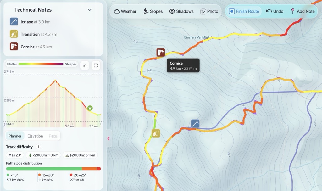 We built Technical Notes for people who plan routes for others: mountain guides, tour leaders, and experienced planners who need to communicate critical information pinned to exact coordinates on the track.
