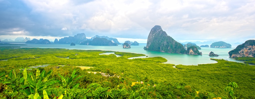 Ao Phang-nga National Park (อุทยานแห่งชาติอ่าวพังงา) is one of the main of 156 national parks in Thailand, a country in Southeast Asia, located in the south of its territory. The main feature of the park is the incredibly beautiful postcard-like tropical landscape of Phang-nga Bay of the Andaman Sea of the Indian Ocean with numerous limestone tower karst forested islands. First and foremost is Khao Phing Kan, standing freely in the water near the coast. The park also contains one of the largest and best-preserved mangrove forests in all Thailand. There are 5 named mountains in Ao Phang-nga National Park. The highest and most prominent mountain is Khao Phang (381 m / 1,250 ft).