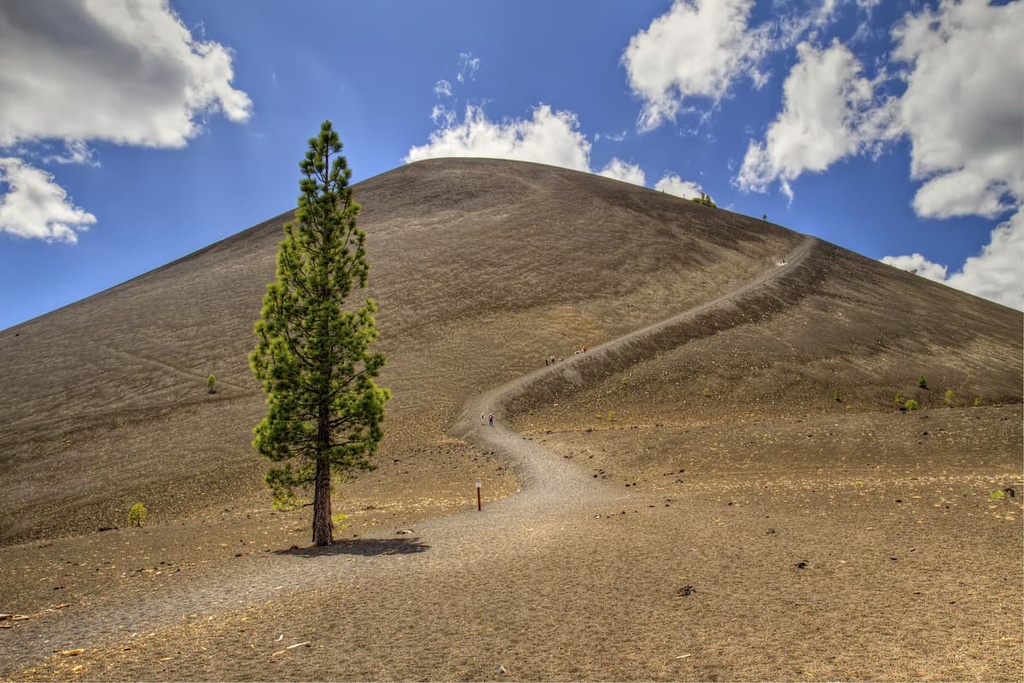 Near the start of the route, hikers have the option to add mileage to their hike by summiting Cinder Cone. The rest of the trail loops around the mountain, passing Butte and Snag Lake in the process. Painted dunes and lava beds are visible throughout this hike, too.