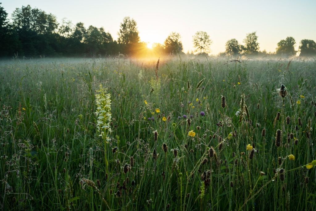 The meadows around the lakes vary in type, with extensive wetlands dominating areas prone to more frequent flooding and drier grasslands occupying less flood-prone areas. Wet meadows host plants like wild gladiolus and marsh gentian, while dry grasslands support species like fly orchids and greater butterfly orchids.