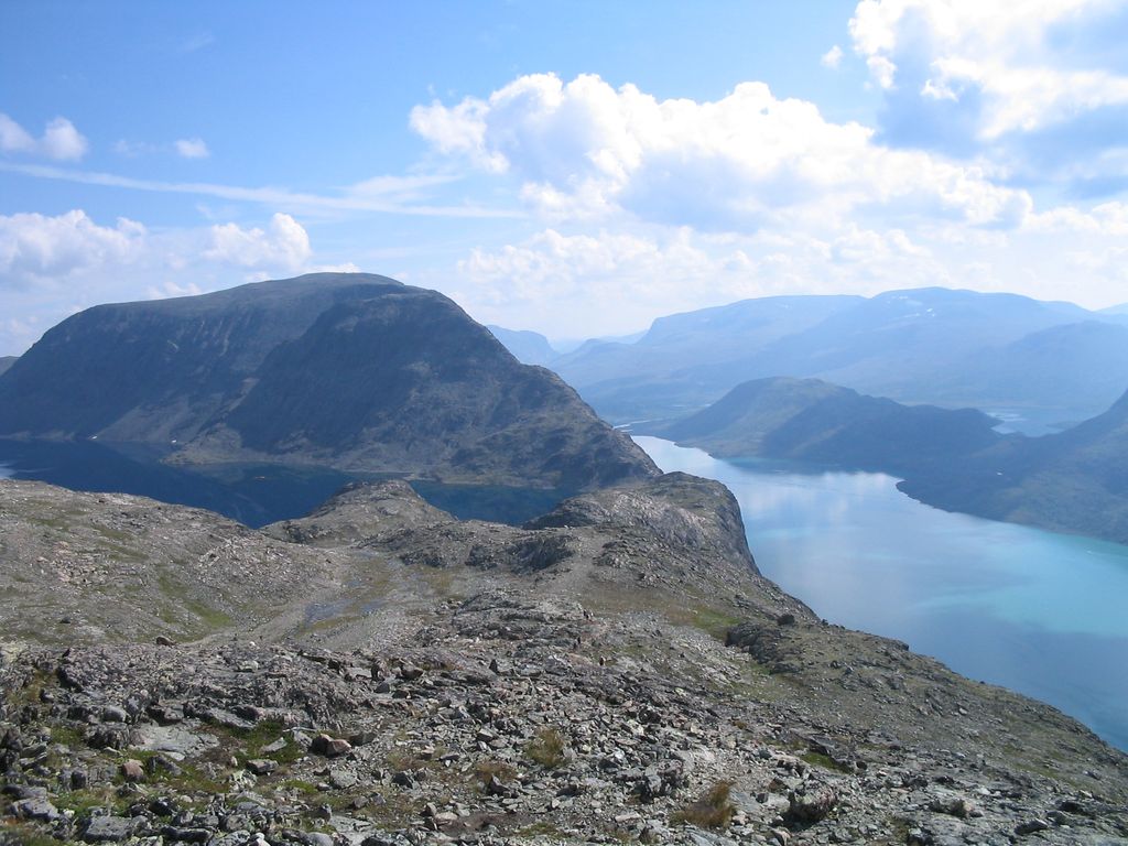 Besseggen or Besseggi is a mountain ridge in Vågå Municipality in Innlandet county, Norway. The 1,634-metre (5,361 ft) tall mountain ridge is located in the Jotunheimen mountains within Jotunheimen National Park. The mountain sits about 46 kilometres (29 mi) southwest of the village of Vågåmo and about 30 kilometres (19 mi) northwest of the village of Beitostølen. The mountain ridge is surrounded by several other notable mountains including Veslfjellet to the east and Besshø to the northwest. The ridge runs between the lakes Gjende and Bessvatnet.