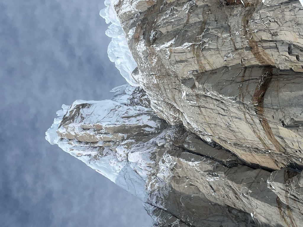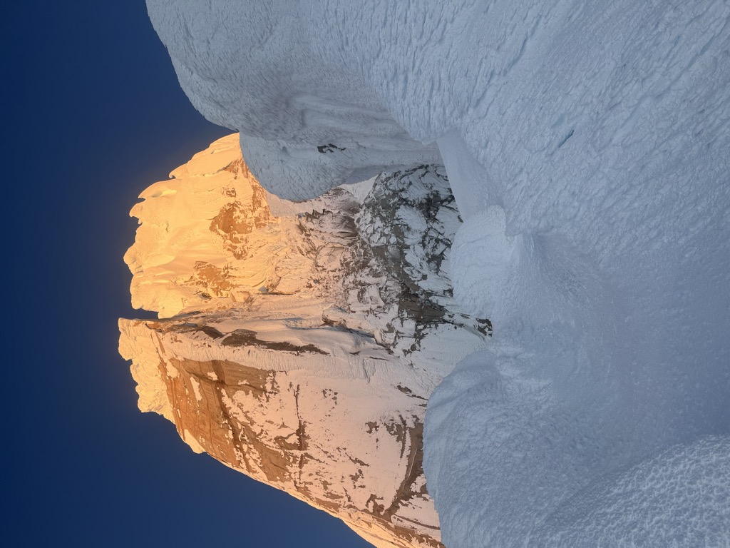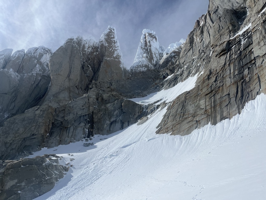 Cerro Torre is one of the mountains of the Southern Patagonian Ice Field in South America. It is located in Argentina and Chile, west of Fitz Roy (also known as Cerro Chaltén). The peak is the highest of a four mountain chain: the other peaks are Torre Egger (2,685 m (8,809 ft)), Punta Herron, and Cerro Standhardt. The top of the mountain often has a mushroom of rime ice, formed by the constant strong winds, increasing the difficulty of reaching the actual summit.