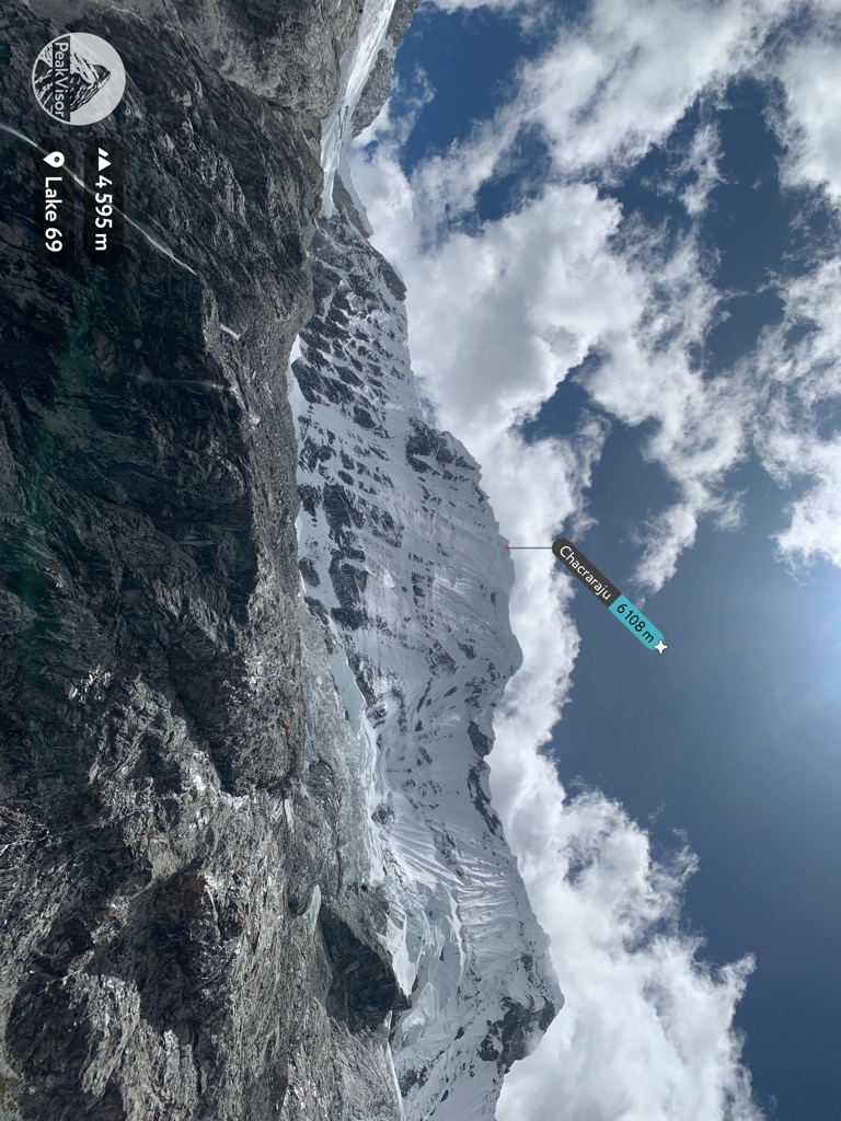 Chacraraju or Chakraraju (possibly from Quechua chakra little farm; field, land sown with seed, rahu snow, ice, mountain with snow) is a mountain in the Cordillera Blanca range in the Andes of Peru. The mountain has two distinctive peaks: Chacraraju Oeste (west summit; 6,108 metres (20,039 ft)) and Chacraraju Este (east summit; 6,001 metres (19,688 ft)). Chacraraju is located in Huaylas Province, Ancash; south and southeast of Pirámide and east of Lake Parón. The peak is accessible from the Pisco base camp at Cebollapampa.