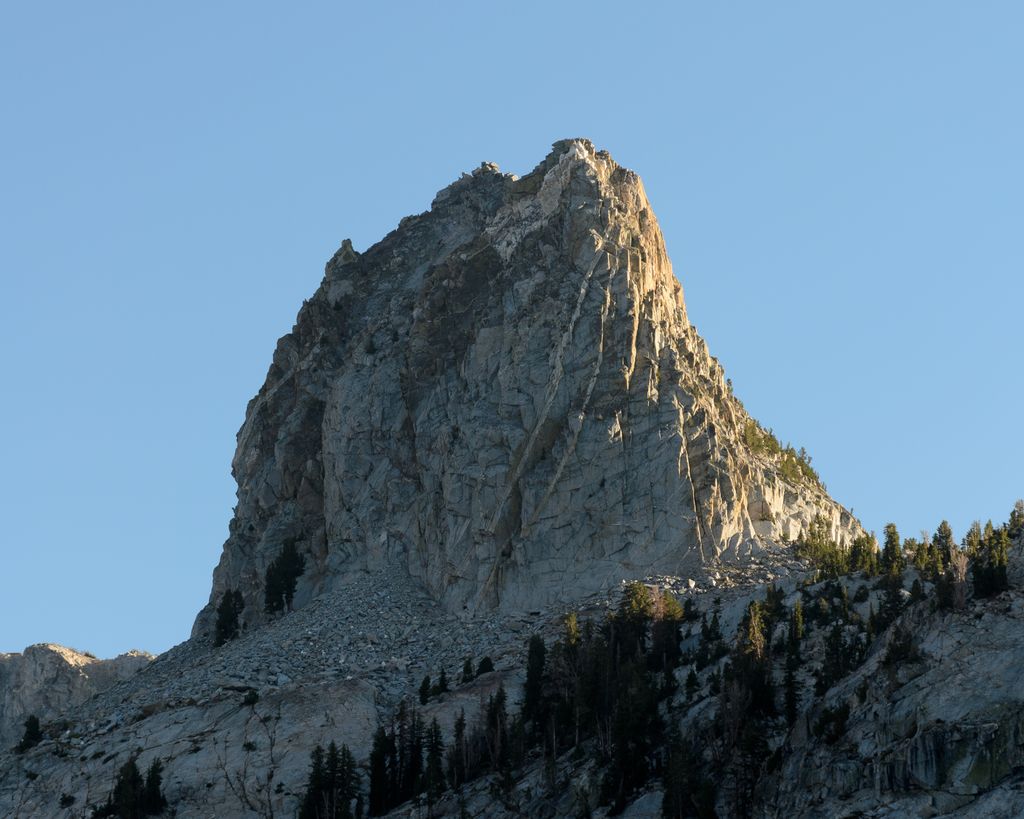 Crystal Crag is a 10,377-foot-elevation (3,163 meter) summit located in the Sierra Nevada mountain range in Mono County of northern California, United States. This photogenic landmark, popular with rock climbers, is situated approximately three miles south of the community of Mammoth Lakes, on land managed by Inyo National Forest. Topographic relief is significant as the north aspect rises 1,300 feet (400 meters) above Lake George in one-half mile. Crystal Lake lies below the west aspect and T J Lake below the east aspect. Precipitation runoff from the peak drains into these three lakes, thence north to Mammoth Creek. This mountain's toponym has been officially adopted by the United States Board on Geographic Names.