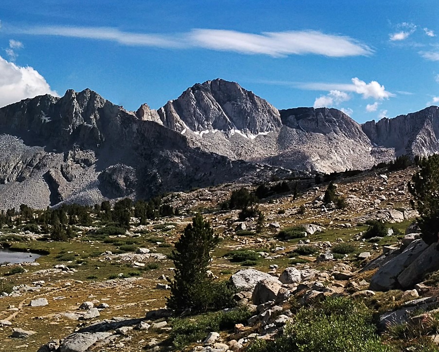 Giraud Peak is a 12,608-foot-elevation (3,843-meter) mountain summit located west of the crest of the Sierra Nevada mountain range, in Fresno County of northern California, United States. It is situated in the Palisades area of northern Kings Canyon National Park, 3.0 miles (4.8 km) southwest of North Palisade, and 1.5 miles (2.4 km) southwest of Columbine Peak, the nearest higher neighbor. Giraud Peak ranks as the 258th-highest summit in California. Topographic relief is significant as the west aspect rises 4,400 feet (1,300 meters) above LeConte Canyon in less than two miles. On the direct opposite side of the canyon The Citadel stands guard. The first ascent of the summit was made September 1, 1925, by Norman Clyde via the east arête.