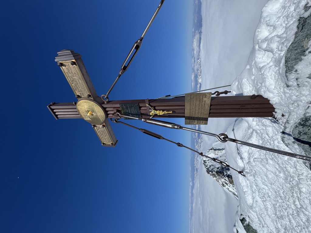 The characteristic pyramid-shaped peak actually consists of two pinnacles, the Grossglockner and the Kleinglockner (3,770 m or 12,370 ft, from German: groß 'big', klein 'small'), separated by the Glocknerscharte col.