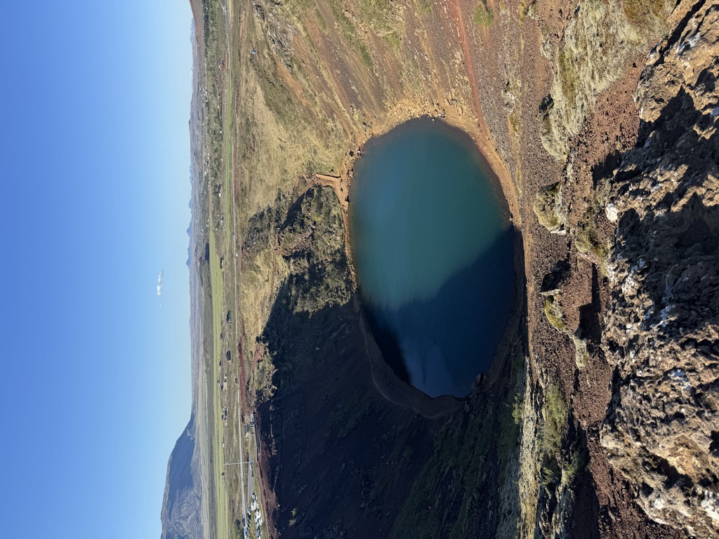 Kerið (Icelandic pronunciation: [ˈcʰɛːrɪθ]; also Kerith or Kerid) is a volcanic crater lake located in the Grímsnes area in south Iceland, along the Golden Circle. It is one of several crater lakes in the area, known as Iceland's Western Volcanic Zone, which includes the Reykjanes peninsula and the Langjökull Glacier, created as the land moved over a localized hotspot, but it is the one that has the most visually recognizable caldera still intact. The caldera, like the other volcanic rock in the area, is composed of a red (rather than black) volcanic rock. The caldera itself is approximately 55 m (180 ft) deep, 170 m (560 ft) wide, and 270 m (890 ft) across. Kerið's caldera is one of the three most recognizable volcanic craters at an age of approximately 6,500 years. It is only half as old as most of the surrounding volcanic features. The other two are Seyðishólar and Kerhóll.