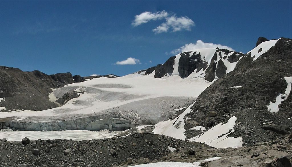 Klondike Peak (13,120 ft (4,000 m)) is located in the northern Wind River Range in the U.S. state of Wyoming. Situated 4 mi (6.4 km) north of Gannett Peak, Klondike Peak is within the Bridger Wilderness of Bridger-Teton National Forest and west of the Continental Divide. The summit of Klondike Peak is partially capped by a small glacier and the northwest flank of the peak is the origination point of J Glacier, while Sourdough Glacier lies just to the northeast. Klondike Peak is the 26th tallest peak in Wyoming.