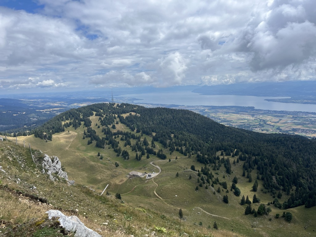 La Dôle overlooks to south-east the summit of La Barillette, the town of Nyon, Lake Geneva and across the lake the Alps, including the Bernese Alps the Chablais Alps and the Mont Blanc massif. To the south are views of the City of Geneva and the Canton of Geneva; to the north the village of Les Rousses. The Dôle massif has a second peak to the northeast, the Pointe de Poêle Chaud, accessible via the col between them which drops to 1557 m.