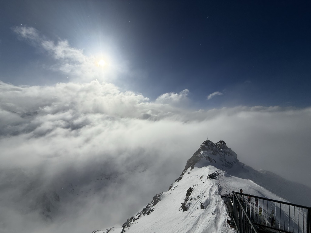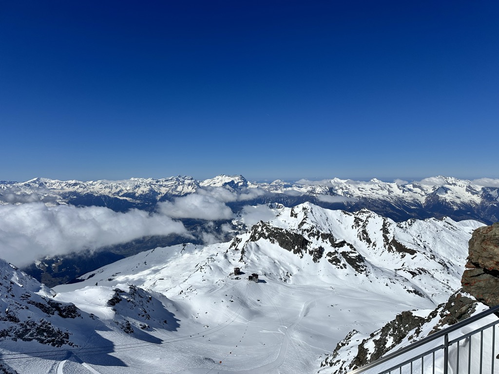The summit of Mont Fort is easily accessible by cable car from the heights of Verbier or Nendaz. The cable cars from the two valleys converge at the intermediate station (2,894 metres (9,495 ft)) north of the Col des Gentianes, the upper section reaching a height of 3,308 metres (10,853 ft). In the winter and early spring season, the mountain, including the Glacier de Tortin, is the culminating point of the 4 Vallées ski area, accessible by the "Mont-Fort" cable car. There is one ski slope leading down from the mountain's peak - which then leads down to the Col des Gentianes, where a restaurant and two cable cars leading down to Verbier and Siviez (Haute-Nendaz) are situated.