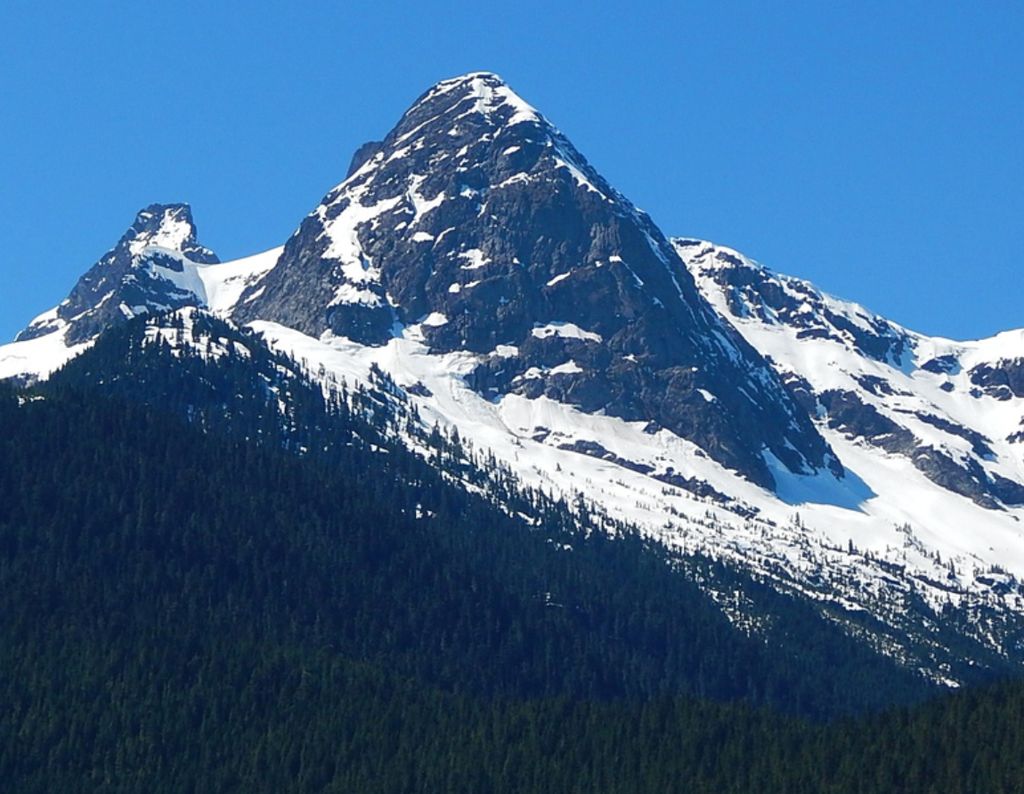 Pyramid Peak is a 7,189-foot (2,191-metre) mountain summit in the North Cascades Range of Washington, United States. It is located within North Cascades National Park. It rises steeply from Diablo Lake, one of the reservoirs on the Skagit River. It is part of a group of peaks that form the northern end of a chain running south through climbing destinations such as Colonial Peak, Paul Bunyans Stump, and Snowfield Peak. Like many North Cascade peaks, Pyramid Peak is more notable for its large, steep rise above local terrain than for its absolute elevation. Topographic relief is significant as the summit rises 6,400 feet (2,000 meters) above the Skagit River in 2.5 miles (4 km). Precipitation runoff from the mountain drains into Diablo Lake and Skagit River.