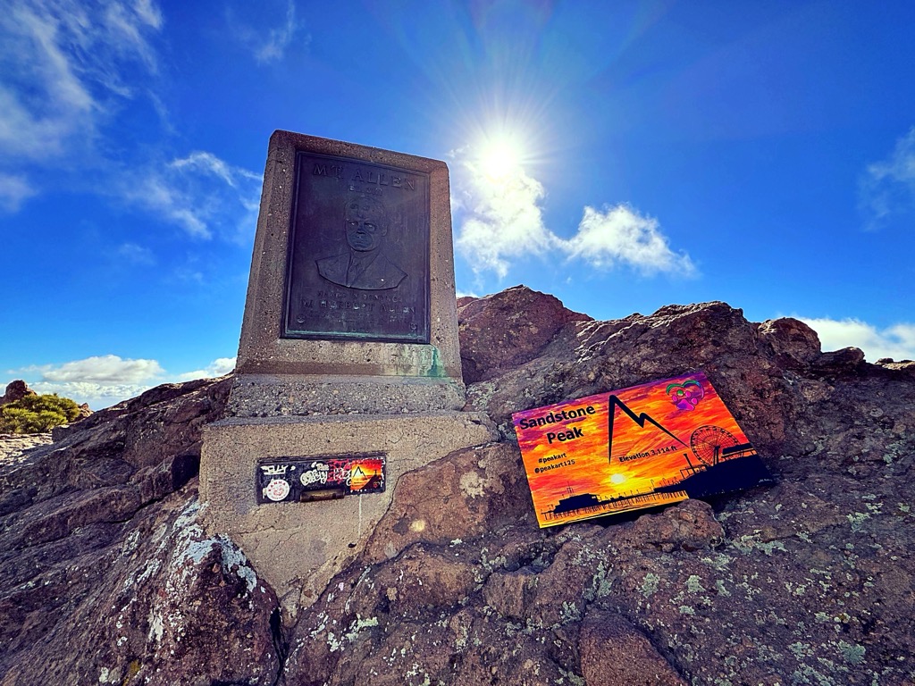Sandstone Peak, also known as Mount Allen, is a mountain in Ventura County, California. It is the highest summit in the Santa Monica Mountains, with an elevation of 3,114 feet (949 m). Located near the western edge of the Santa Monica Mountains National Recreation Area, the summit provides panoramic views of Malibu, the Pacific Ocean, Santa Monica, the Conejo Valley, and four of the Channel Islands.