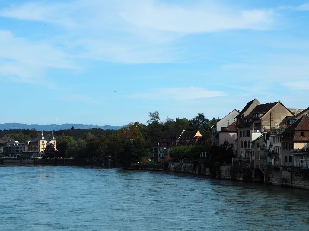 30m tiefer Absturz im Rhein-Untergrund sorgt für Fallwasserzone mit starken Unterwasserwirbeln und Sog. Das ist an der Oberfläche kaum erkennbar, kann aber lebensgefährlich sein. Zur Durchfahrt den Brückenbogen ganz rechts wählen.