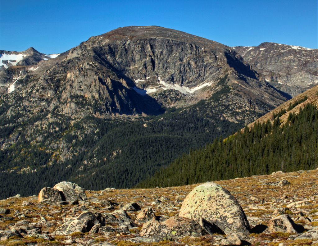 Terra Tomah Mountain is a 12,718-foot-elevation (3,876-meter) mountain summit located in Rocky Mountain National Park, in Larimer County, of Colorado, United States. It is situated 13 miles west of the community of Estes Park, and 1.5 mile east of the Continental Divide. Terra Tomah Mountain is part of the Front Range which is a subset of the Rocky Mountains. Topographic relief is significant as the northeast aspect rises 3,300 feet (1,000 meters) above Forest Canyon in 1.5 mile. It is a prominent landmark viewed from Forest Canyon Overlook along the Trail Ridge Road.