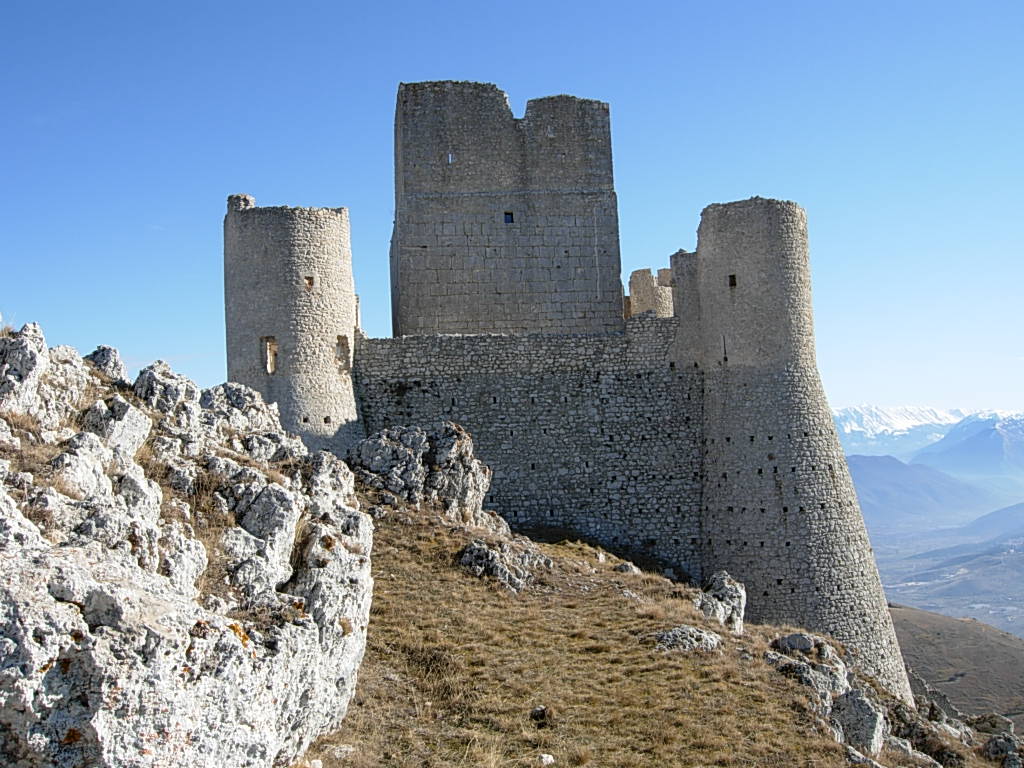 The Castle of Rocca Calascio is a mountaintop fortress or rocca in the municipality of Calascio, in the Province of L'Aquila, Abruzzo, Italy. At an elevation of around 1,460 metres (4,790 ft), the castle is the highest fortress in the Apennines. Built of stone and masonry exclusively for military purposes and intended only to accommodate troops and never as a residence for nobles, the fortress overlooks the Plain of Navelli at one of the highest points in the ancient Barony of Carapelle. Construction of the fortress started in the tenth century as a single watchtower. A walled courtyard with four cylindrical towers at the corners around a taller inner tower was added in the thirteenth century. The lower half of the fortress is built with distinctively larger stones than its upper half. It is believed that this feature was to make its base impenetrable to invaders. The fortress was never tested in battle. However, it was badly damaged in November 1461 by the 1461 L'Aquila earthquake with an estimated magnitude of 7 to 8 on the Richter Scale. While the town of Calascio, which lies below the fortress, was rebuilt, the fortress was not. The Castle of Rocca Calascio lies within the Gran Sasso e Monti della Laga National Park and alongside the high plain of Campo Imperatore.