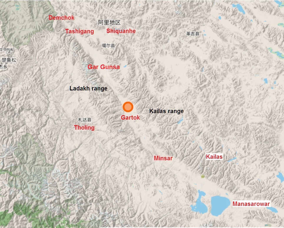 Gartok (Tibetan: སྒར་ཐོག, Wylie: sGar-thog) is made of twin encampment settlements of Gar Günsa and Gar Yarsa (Tibetan: སྒར་དབྱར་ས, Wylie: sGar-dbyar-sa, Wade–Giles: Ka-erh-ya-sha) in the Gar County in the Ngari Prefecture of Tibet. Gar Gunsa served as the winter encampment and Gar Yarsa as the summer encampment. But in British nomenclature, the name Gartok was applied only to Gar Yarsa and the practice continues to date. Gartok was established as Lhasa's administrative headquarters for Western Tibet (Ngari) after it conquered it from Ladakh in 1684. A senior official called Garpön was stationed here. Gartok (Gar Yarsa) also served as Western Tibet's principal trade-market. But the village itself was small and is said to have been quite poor. After the Chinese annexation of Tibet, the headquarters of Western Tibet was moved to Shiquanhe. Gar Yarsa is situated on the bank of the Gartang River, one of the headwaters of the Indus River, at the base of the Kailash Range, at an elevation of 4,460 metres (14,630 ft).
