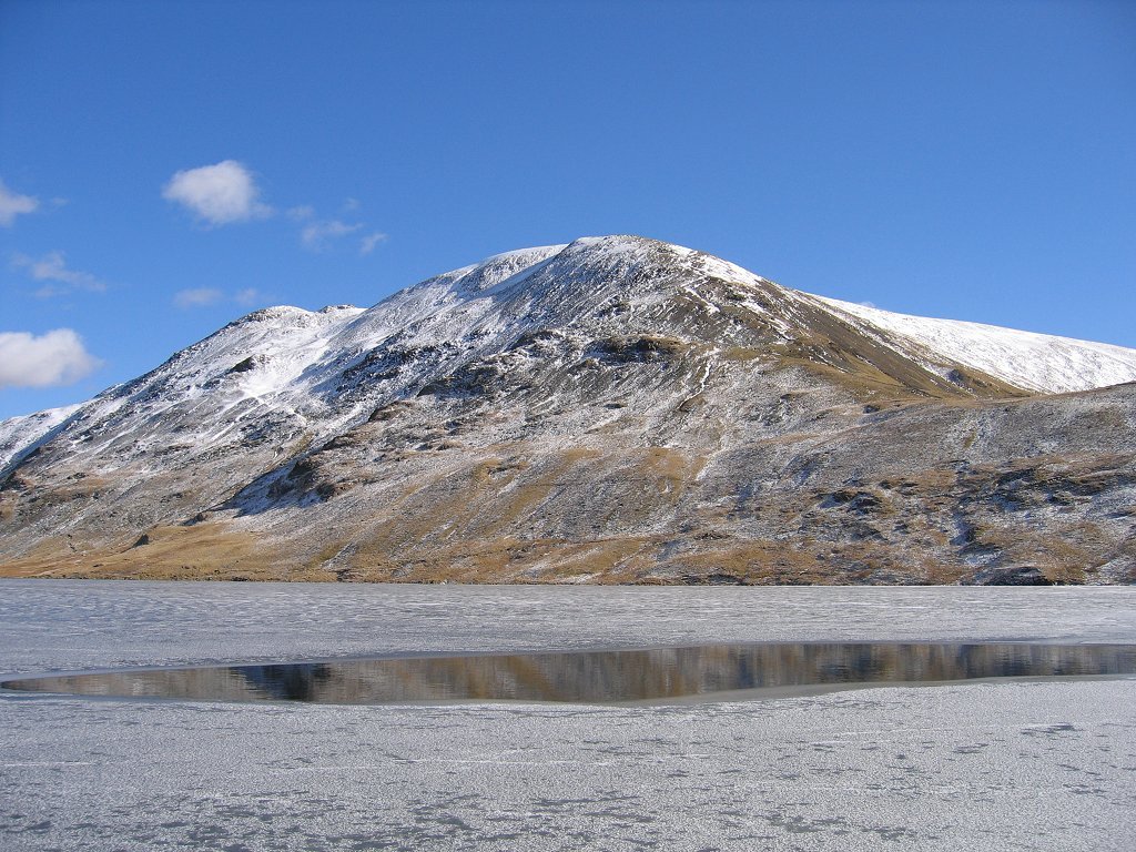 Grisedale Tarn is a tarn in the Lake District of England between Fairfield and Dollywagon Pike. It is the legendary resting place of the crown of the kingdom of Cumbria, after the crown was conveyed there in 945 by soldiers of the last king, Dunmail, after he was slain in battle with the combined forces of the English and Scottish kings. Grisedale Tarn is 538 metres (1,765 ft) in altitude and has a maximum depth of around 33 metres (108 ft). It holds brown trout, perch and eels. The outflow is to Ullswater to the north-east, picking up all of the rainfall from the eastern face of Dollywagon Pike. The Tarn is the subject of a poem by the Rev. Frederick William Faber printed in 1840.