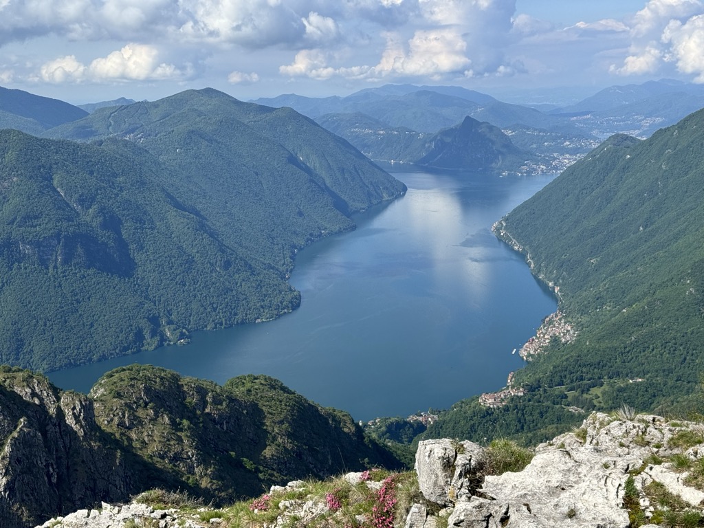 Lake Lugano (Italian: Lago di Lugano or Ceresio, from Latin: Ceresius lacus; Lombard: Lagh de Lugan) is a glacial lake which is situated on the border between southern Switzerland and northern Italy. The lake, named after the city of Lugano, is situated between Lake Como and Lago Maggiore. It was cited for the first time by Gregory of Tours in 590 with the name Ceresio, a name which is said to have derived from the Latin word cerasus, meaning cherry, and refers to the abundance of cherry trees which at one time adorned the shores of the lake. The lake appears in documents in 804 under the name Laco Luanasco. There are various mountains and tourist destinations on the shores of the lake including Monte Brè to the east, Monte San Salvatore west of Lugano, and Monte Generoso on the south-eastern shore. The World Heritage Site Monte San Giorgio is situated south of the lake. Also located to the south is the Cinque Vette Park. The lake is drained by the Tresa, which empties into Lake Maggiore, the latter being drained by the Ticino and the Po.