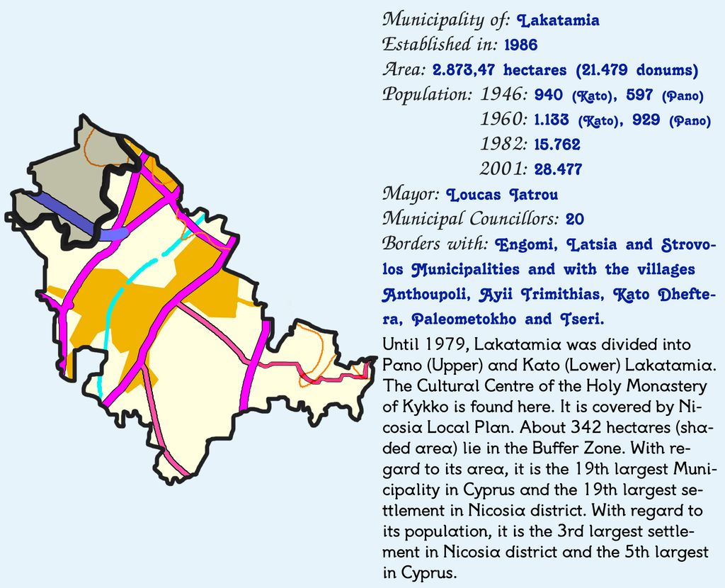 Lakatamia (Greek: Λακατάμια [lakaˈtamɳa]; Turkish: Lakadamya) is a southwestern suburb of Nicosia, Cyprus. In terms of population, Lakatamia municipality is the third largest municipality in Nicosia district and the fifth largest municipality in Cyprus (after Limassol, Strovolos, Nicosia and Larnaca). In 2011 Lakatamia had a population of 38,345. Due to the expansion of the Nicosia urban area, Lakatamia has grown from two small villages (Upper and Lower Lakatamia) into a sizeable suburb. Lower Lakatamia used to be inhabited by both Greek and Turkish Cypriots until the mid-1950s. Its name originates from "alakatia", i.e. wells, which were apparently abundant in the old village. Lakatamia Airfield, an airstrip used by the Cypriot National Guard, is located to the east of Lakatamia. Lakatamia is also home to a football club EN THOI Lakatamia who has played in the Cypriot First Division, however for only one season in their history. THOI usually play in the lower leagues and are currently in the Cypriot Third Division. Cypriot international Valentinos Sielis used to play at the club