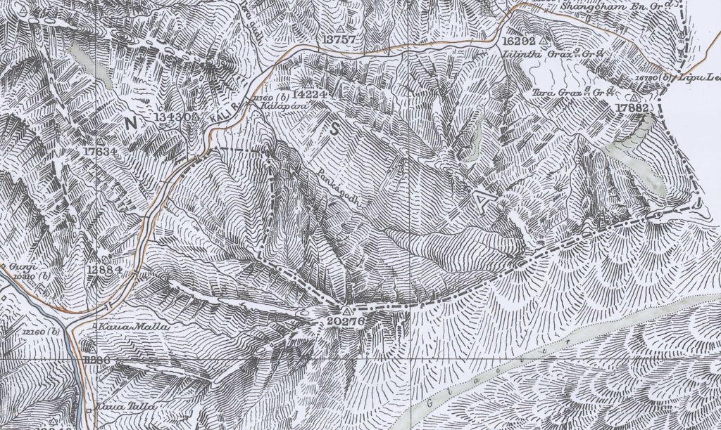 Lipulekh La, Lipulekh Pass or Lipu Gad as called in Kumaoni is a Himalayan pass at the border between Kumaon, India and Tibet region held by China. The Old Lipulekh Peak or Old Lipulekh Pass, a Mount Kailash viewing point at 17,500 ft elevation, lies west of Lipulekh Pass. The Lipulekh pass is near the trading town of Taklakot (Purang) in Tibet and has been used since ancient times by traders, mendicants and pilgrims transiting between India and Tibet. It is also used by pilgrims to Kailas and Manasarovar. It is reached by the Pithoragarh-Lipulekh Pass Highway (PLPH), and a spur from Nabhidhang (Nabidhang) runs along a glaciated river to Om Parvat. Mount Kailash in Tibet can be viewed from India from the Old Lipulekh Peak (via NH-9 motorable till the pass) which lies northeast of Gunji and the Limpiyadhura Pass (via Kuthi Valley) which lies northwest of Gunji. The Kali River (Sharda River) rises from the Limpiyadhura northeast of Gunji and flows by the KMVN Huts (Kumaon Mandal Vikas Nigam resort) at Nabhidhang (a fork route from Nabhidhang goes southeast along the glaciated rivulet to Om Parvat), ITBP Base Camp, Indian Forest Police Checkpost to Gunji.