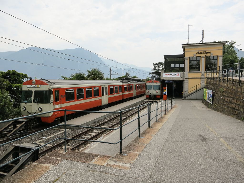 Lugano FLP railway station (Italian: Stazione di Lugano FLP) is a railway station in the municipality of Lugano, in the Swiss canton of Ticino. It is the eastern terminus of the 1,000 mm (3 ft 3+3⁄8 in) gauge Lugano–Ponte Tresa line of Ferrovie Luganesi. The station is located in the forecourt of Swiss Federal Railways' main-line Lugano railway station. The station and line opened in 1912. Between 1990 and 1992 the Lugano FLP station was renovated and expanded. The street level building is now a restaurant, although the platforms remain in use at the lower level.