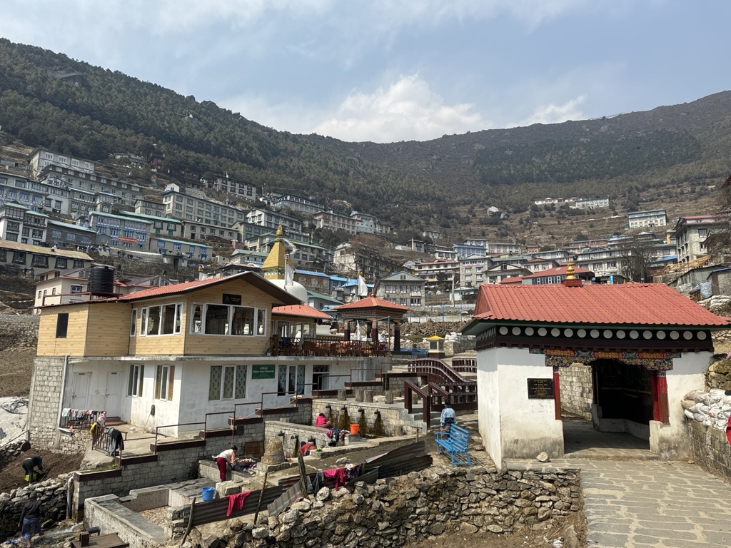 Namche Bazaar (also Namche Bazar, Nemche Bazaar or Namche Baza; Nepali: नाम्चे बजार ) is a town (formally Namche Village Development Committee) in Khumbu Pasanglhamu Rural Municipality in Solukhumbu District of Province No. 1 in northeastern Nepal. It is located within the Khumbu area at 3,440 metres (11,286 ft) at its low point, populating the sides of a hill. Most Sherpa in the tourism business hail from the Namche area. Namche is the main trading center and hub for the Khumbu region. At the 2001 census, it had a population of 1,647 people living in 397 individual households.
