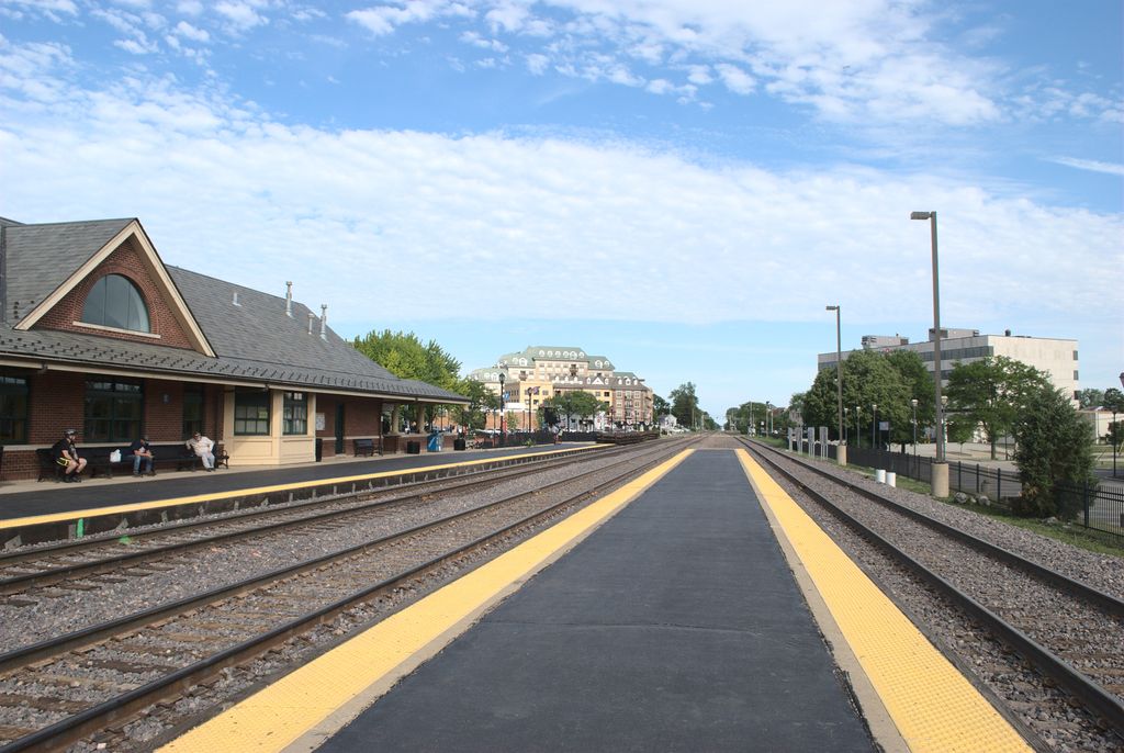 Palatine station is a commuter railroad station on Metra's Union Pacific Northwest Line in the village of Palatine, Illinois. It is officially located at 137 West Wood Street, however there are parking lots for the station scattered within its vicinity, such as those on Smith Street, Colfax Street, Brockway Street, Slade Street, Railroad Avenue, and Palatine Road. Palatine is the outermost station on the UP-NW line to have three tracks, serviced by two platforms. Inbound trains are serviced by the north side platform nearest the station, with outbound and center track express trains serviced by the south island platform. The station is 26.8 miles (43.1 km) from Ogilvie Transportation Center. Due to the Northwest Line's schedule, it is common to see an outbound train and an inbound train arriving at the same time, as Palatine is the halfway point between Ogilvie and Harvard. In Metra's zone-based fare system, Palatine is located in zone 4. As of 2018, Palatine is the seventh busiest of the 236 non-downtown stations in the Metra system, with an average of 2,482 weekday boardings. As of May 30, 2023, Palatine is served by 69 trains (35 inbound, 34 outbound) on weekdays, by 33 trains (16 inbound, all 17 outbound) on Saturdays, and by 20 trains (nine inbound, all 11 outbound) on Sundays. On weekdays, one inbound train originates, and three outbound trains terminate, at Palatine.
