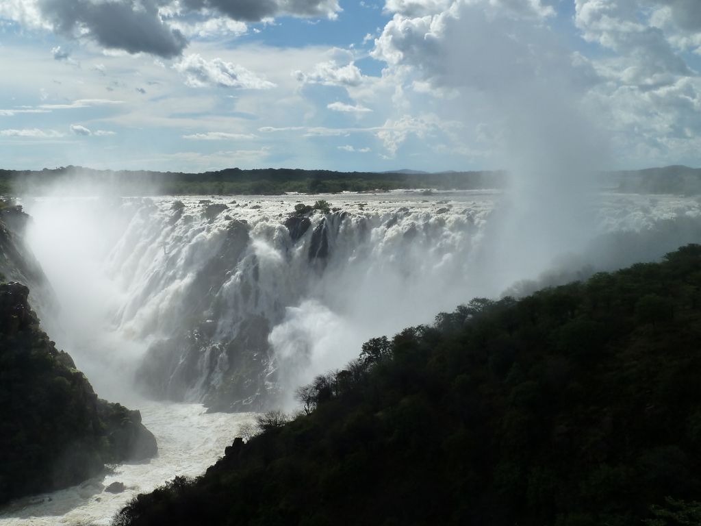 Ruacana Falls is a waterfall located in Ruacana, Omusati on the Kunene River in Northern Namibia. The waterfall is 120 meters (390 ft) high and 700 meters (2,300 ft) wide in full flood. It is among the largest waterfalls in Africa, both by volume and width.