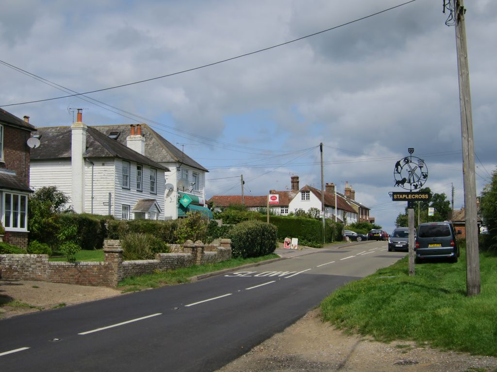 Staplecross is a village in the civil parish of Ewhurst and the Rother district of East Sussex, England. Staplecross is the largest settlement in Ewhurst parish, and is on a southern ridge of the valley of the River Rother which flows through Bodiam at the north of Staplecross. The village is in the High Weald Area of Outstanding Natural Beauty. In 2011 it had a population of 760. Staplecross is 24 miles (40 km) east-northeast from the county town of Lewes, and 3 miles (5 km) east from the A21 road, which in East Sussex runs north to south from Flimwell to Hastings. It is on the B2165 road which runs from the Ewhurst parish village of Cripps Corner, 1,500 yards (1,400 m) to the south, to Beckley, 4 miles (6 km) to the east. While in Staplecross the B2165 locally becomes Northiam Road. The village is centred on the junction of Northiam Road, and Bodiam Road which runs to Bodiam Castle, 2 miles (3 km) to the north. Community amenities and facilities include a village hall with the adjacent Staplecross Club, The Cross Inn public house, a Londis convenience store & post office (the only post office in the parish), a bowls club, and a playing field with a children's play area. On Bodiam Road is Staplecross Methodist Primary School, north from which is a park with tennis courts. At the east of the village is the small red brick parish church of St Mark's which includes a preschool playgroup. A war memorial is at the junction of Northiam Road and Bodiam road. To the south, outside the village on the B1265 is a garden centre and a plant nursery, and at the east, a cattery. At 3 miles to the north-east, in Northiam, is the Lutyens house and gardens of Great Dixter. On the B2244, less than 1 mile north-west from the village, is the 5.5 acres (2.2 hectares) Stainsmoor Wood, managed by a charitable trust. Staplecross is connected by bus to Hastings, Bodiam and Hawkhurst (349), and Westfield, Northiam and Robertsbridge (381). The closest railway station is at Bodiam, part of the heritage Kent and East Sussex Railway, 1.5 miles (2.4 km) to the north, linking to the town of Tenterden at the north-east. The closest National Rail station is at Robertsbridge on the Hastings line, 3 miles to the west, linking to Tunbridge Wells and Hastings.