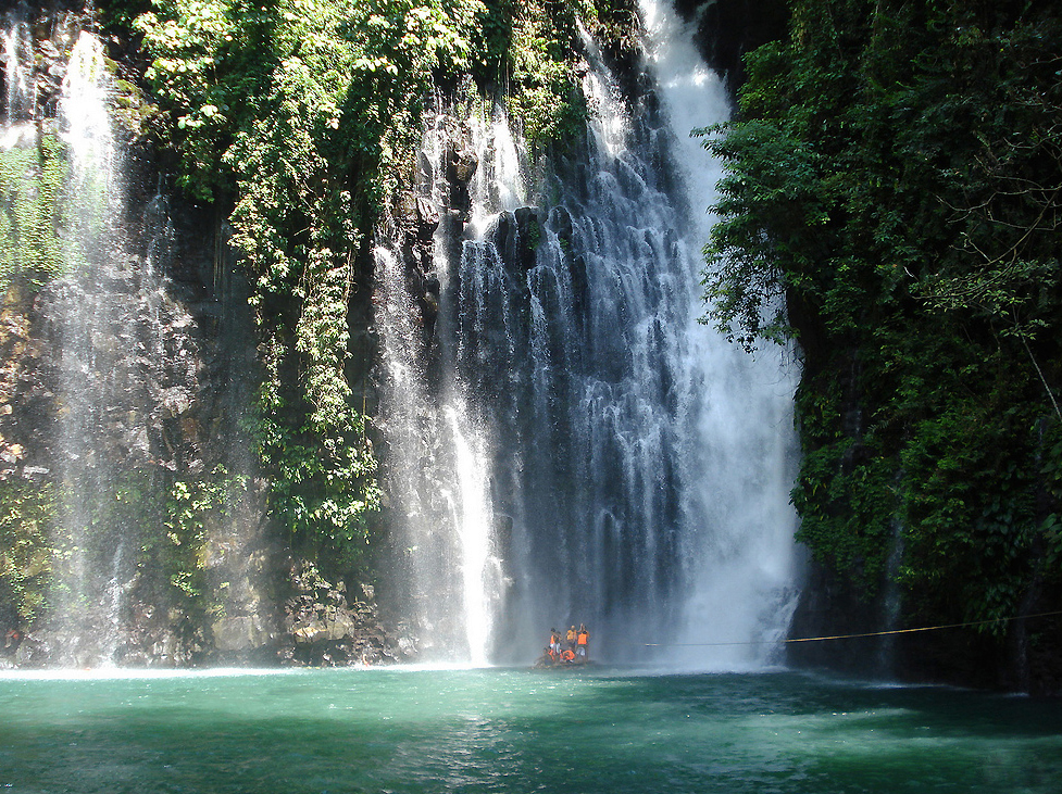Tinago Falls is a waterfall on the Agus River, located in between the town of Linamon and Iligan City, Lanao del Norte in the northern part of the Philippine island of Mindanao. It is one of the main tourist attractions of Iligan, a city known as the City of Majestic Waterfalls. Tinago is a Filipino term meaning "hidden", the falls being hidden in a deep ravine. Trekking to the falls requires approximately 500 descending steps called the winding staircase. The falls is high, its very cold waters cascading beautifully into a deep and calm basin-like pool which appears like a blue-colored lagoon. Under the falls is a small cave where people can enter and listen to the rumbling waters.