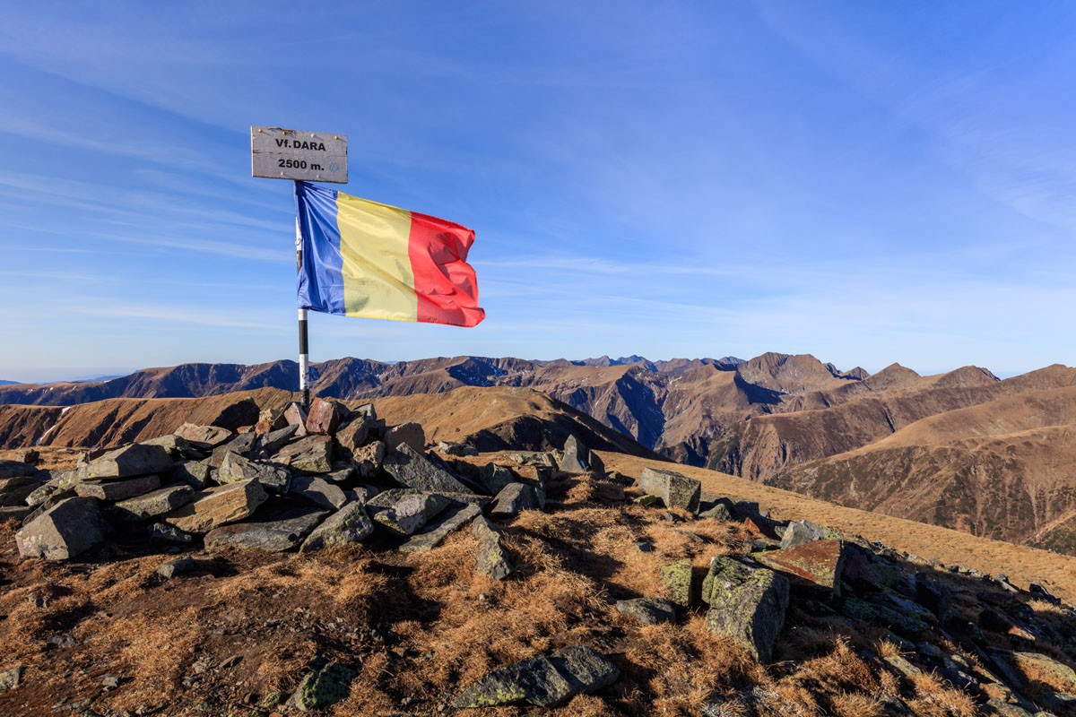 The Făgăraș Mountains are the defining peaks of the Southern Carpathians (also called the Transylvanian Alps). They boast the highest summits in Romania, all sitting along the same imposing spine. The colossal ridge line is visible from hundreds of kilometers across the low-lying plain of Transylvania to the north. The mountains stand out for their impressive steepness, jagged (and sometimes chossy) character, alpine ecosystems, and remoteness. Large portions of the range are far from populated areas in mountain wilderness. The highest peak in the range is Moldoveanu (2,545 m / 8,350 ft), the highest in Romania.