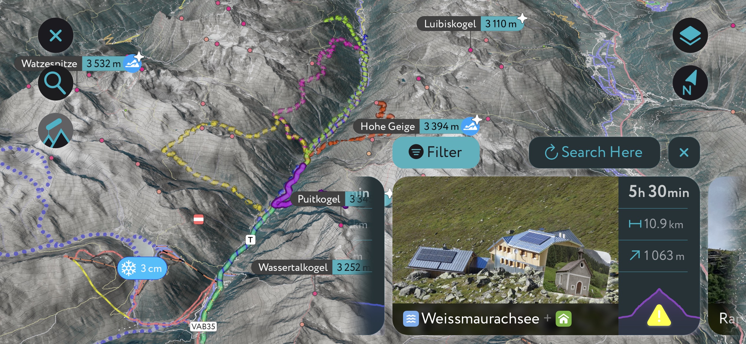 Most recently, the PeakVisor App has included up-to-date weather reports, including snow depths, at any destination. Plus, we've been hard at work adding the details of hundreds of mountain huts, including information on overnight accommodation, dining options, and opening hours. You can also use our Hiking Map on your desktop to create .GPX files for routes to follow later on the app.