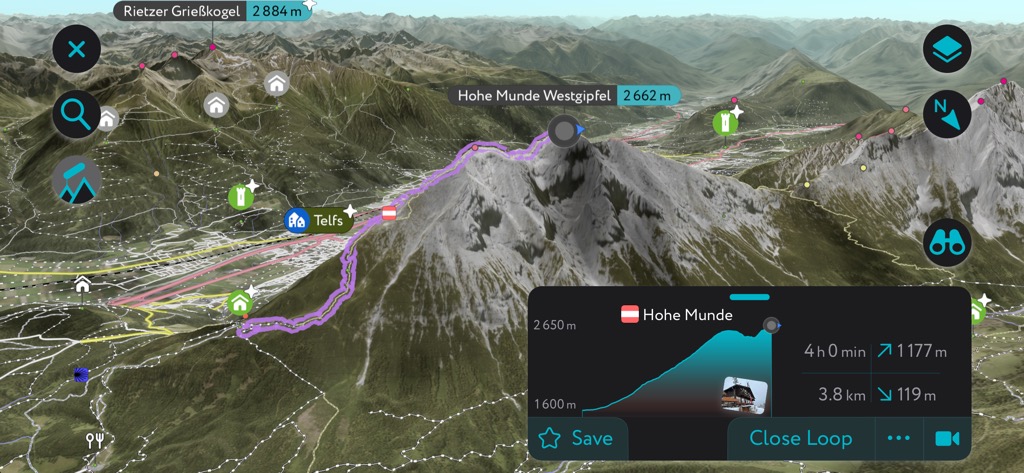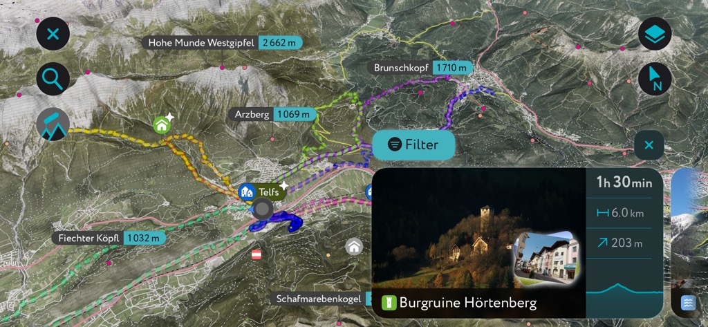 The Mieminger Chain is at the heart of one of our most thoroughly mapped areas. You'll find details on hundreds of ski tours, hiking trails, and mountain huts at your fingertips on the PeakVisor App.