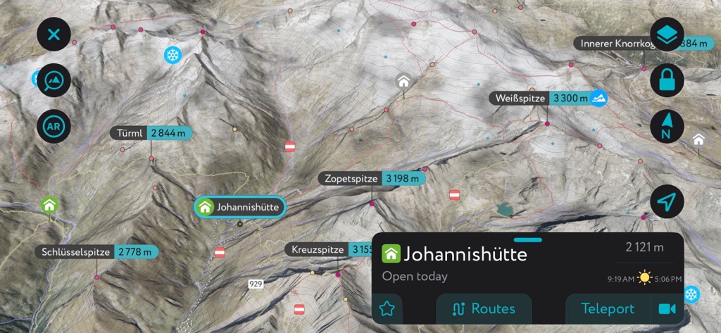 The southern ascent of Großvenediger is considered one of the easier alpine climbs, although it still requires mountaineering skills or hiring a mountain guide. The trail departs from Johannishütte and tracks 16 km (10 mi) out and back with nearly 1,525 m (5,000 ft) of elevation gain.