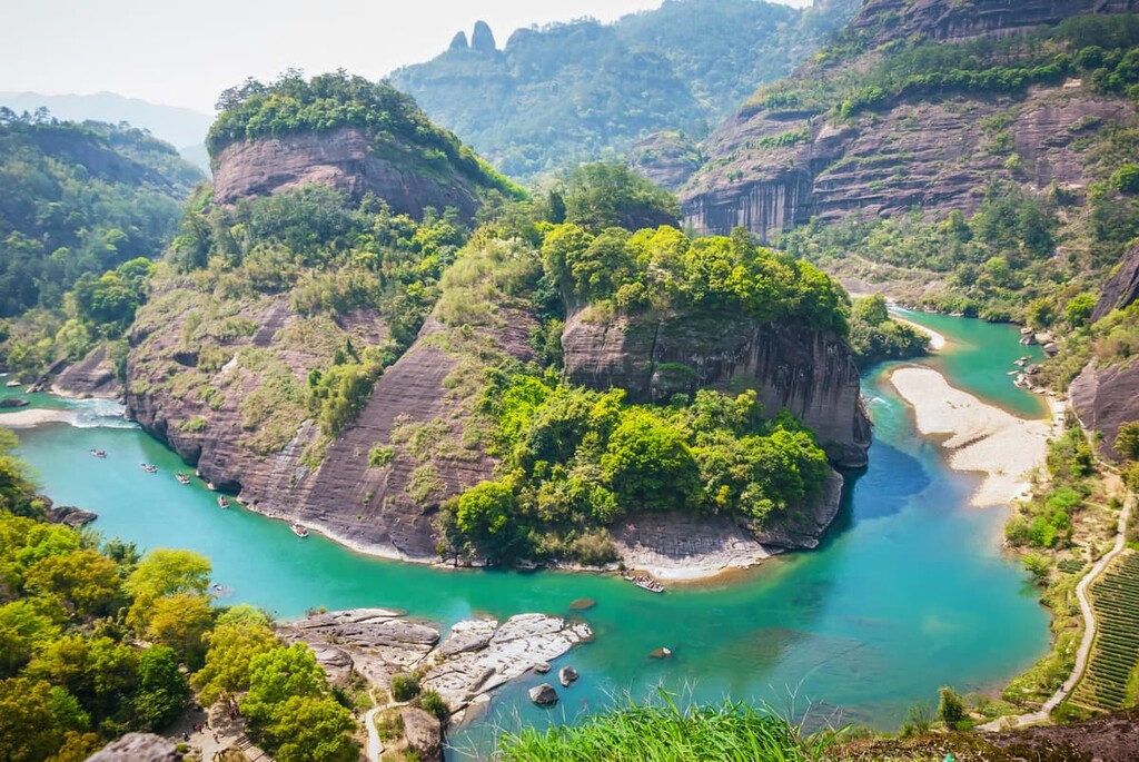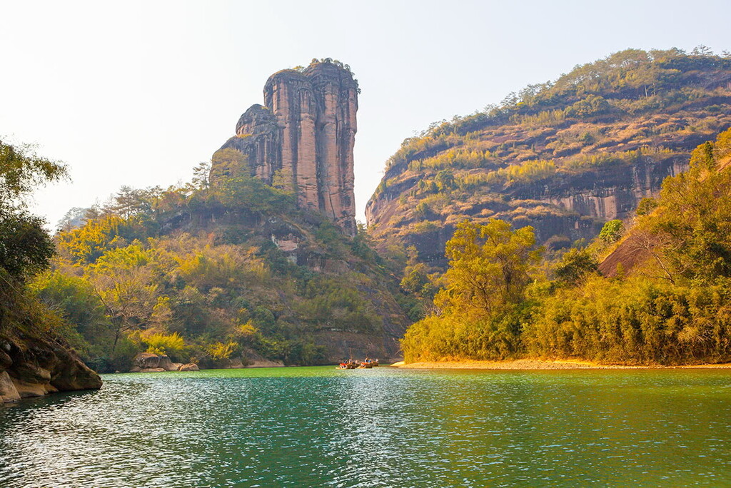 Mount Wuyi (Wu Yi Shan), located in northwest Fujian Province, is a very popular national AAAAA scenic area. The mountain is richly endowed with wonderful, elegant and ancient scenic spots, including Nine Bend Stream (Jiuquxi), Heavenly Tour Peak (Tianyoufeng), Water Curtain Cave (Shuiliandong), Tiger Roaring Rock (Huxiaoyan), A Thread of Sky (Yixiantian), Wuyi Palace, the site of Ziyang Shuyuan and cliff carvings from all the dynasties through history. There are many trails you can choose from to savour the beauty of the area. Of all these, Nine Bend Stream is reputed as the soul of the Wuyi Mountain, winding for 60km including 9.5km through the scenic area. Along both banks is typical Danxia landform. The prettiest part is within the rafting to the north gate.