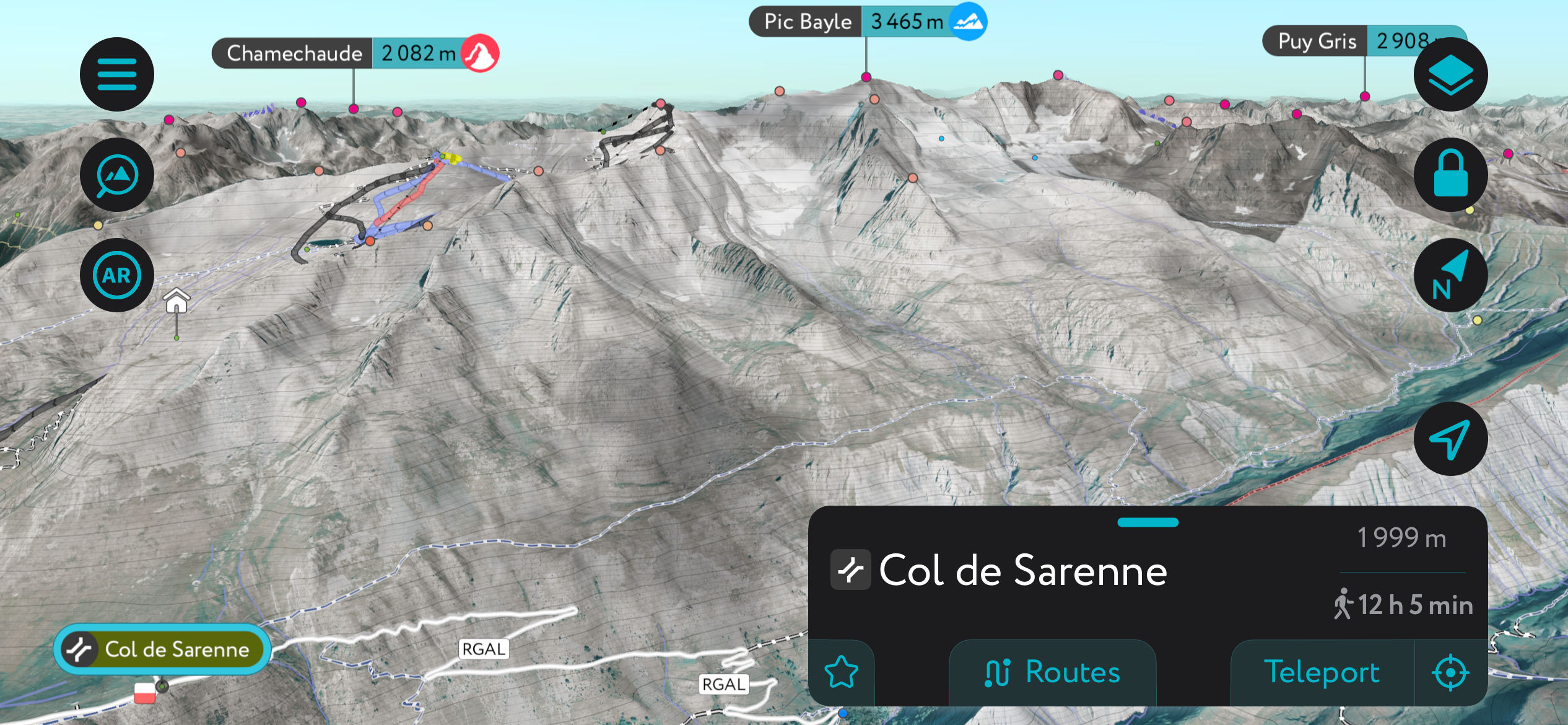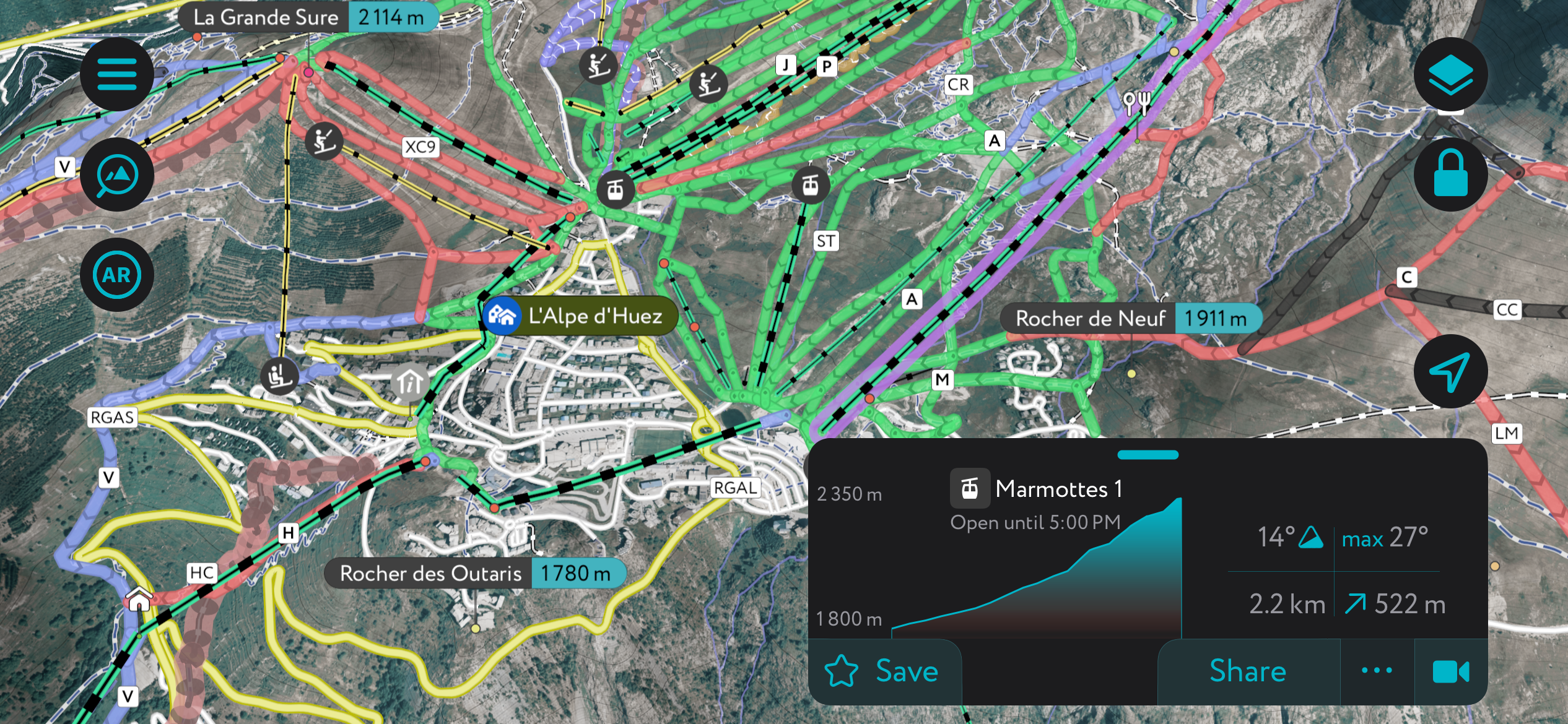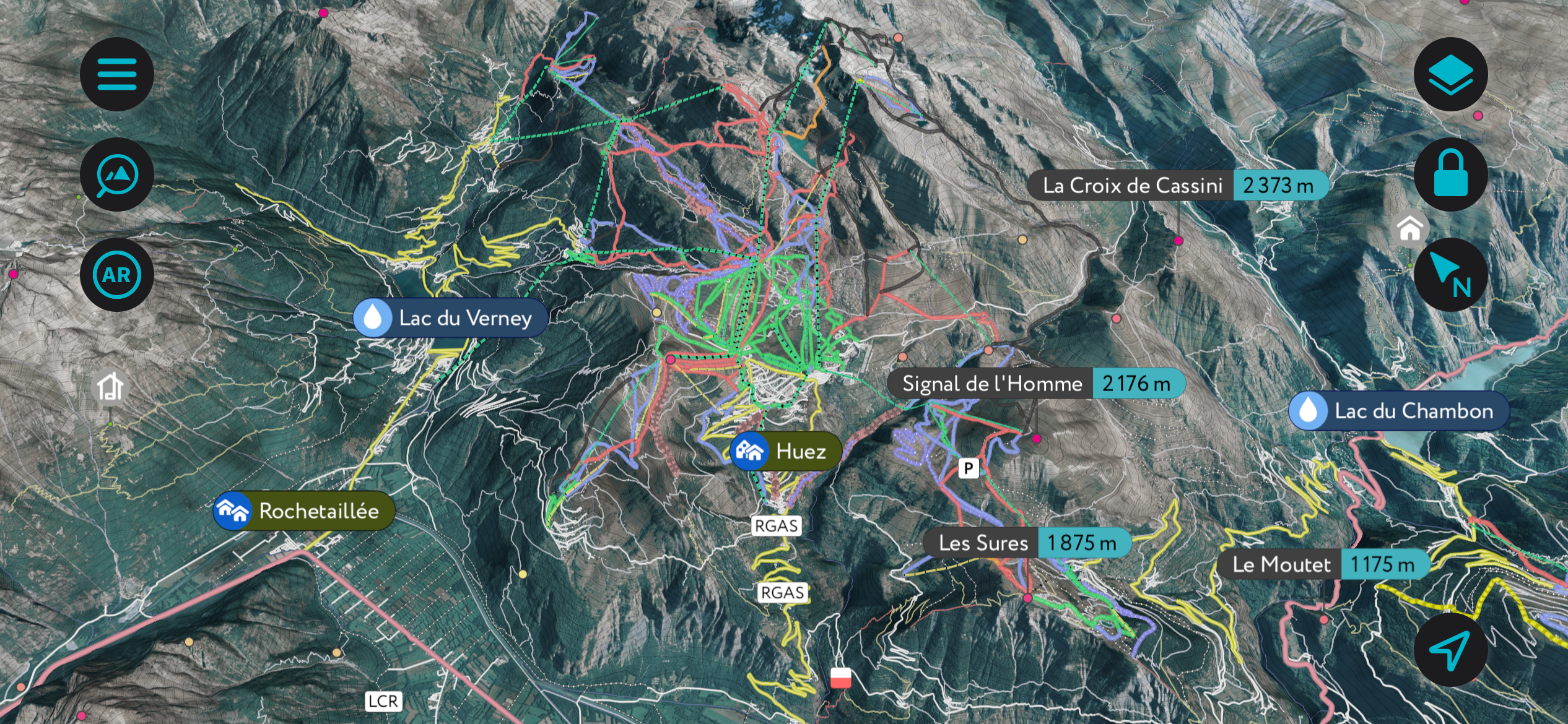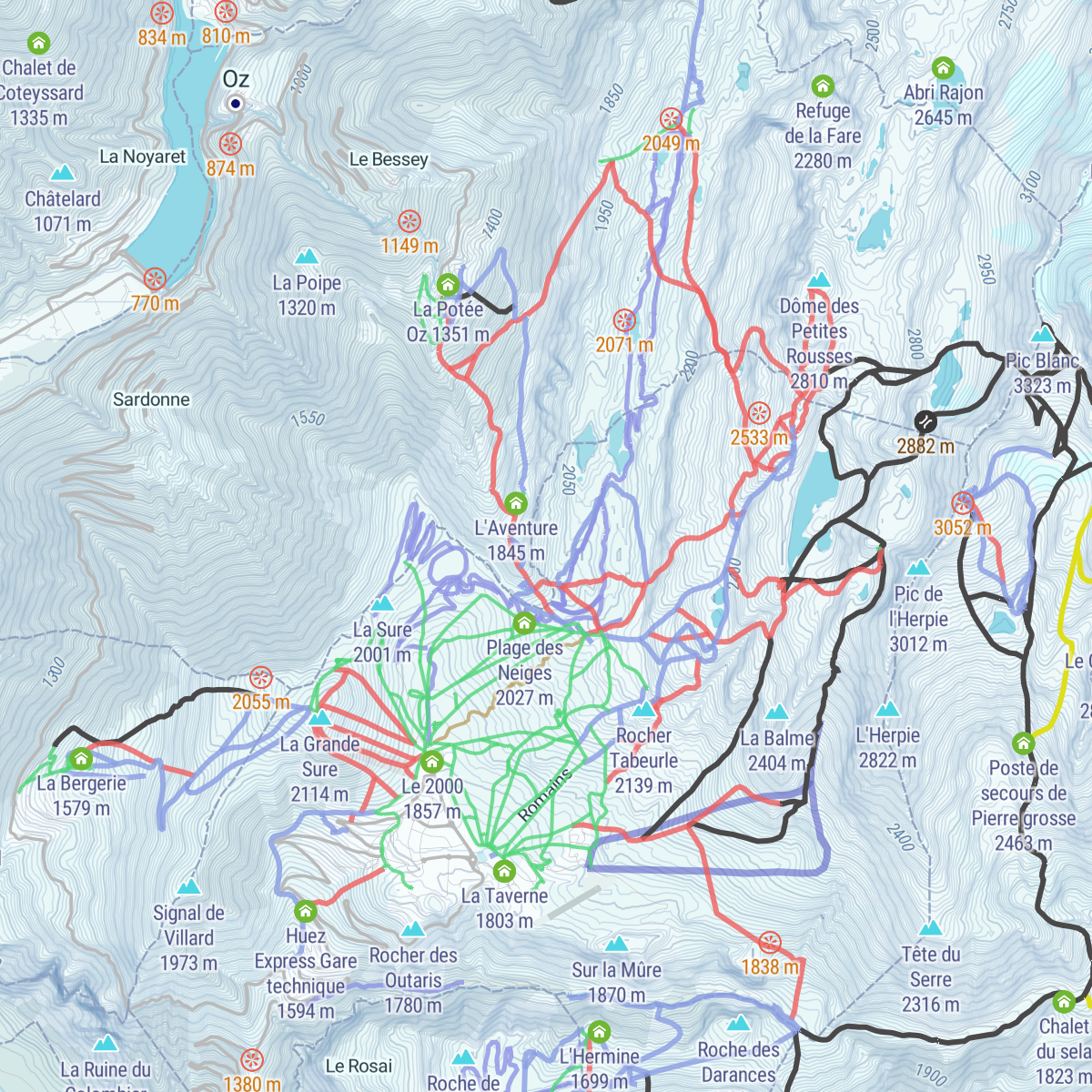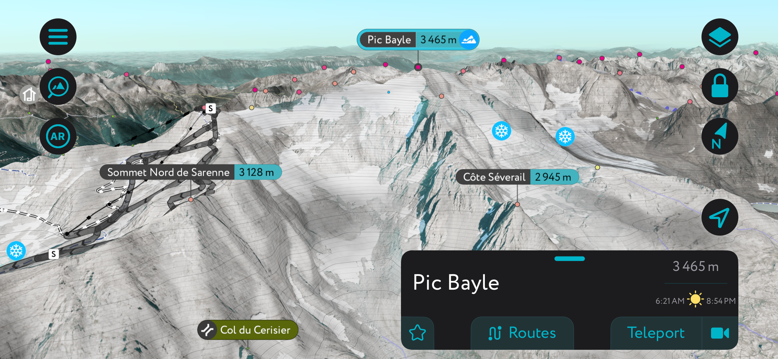 However, the best way to discover Alpe d’Huez is undoubtedly through the PeakVisor mobile app. The app offers an interactive version of the mountain that you can reference at any time, whether you want to know when a lift closes, where a trail goes, or what the surrounding off-piste might look like.