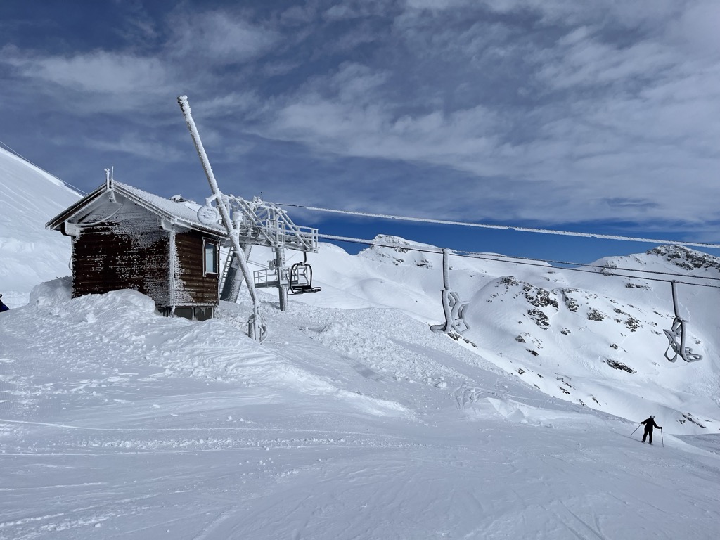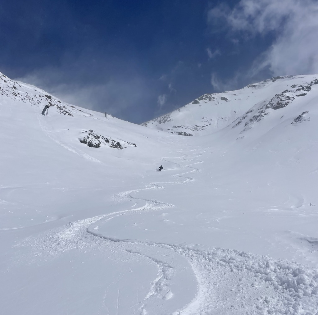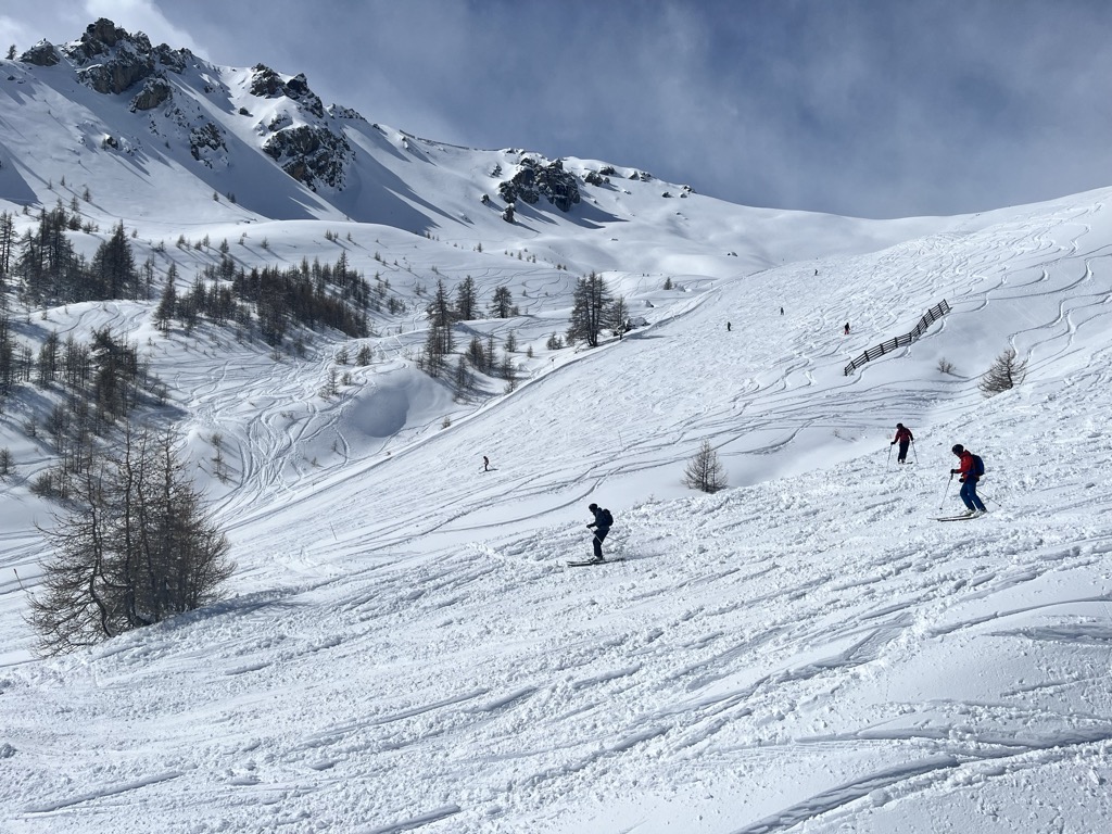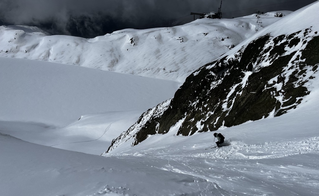 Because it’s high, the snow conditions here stay soft as long as temperatures are reasonably cold. However, it is quite south-facing, so things deteriorate if it’s warm or sunny.