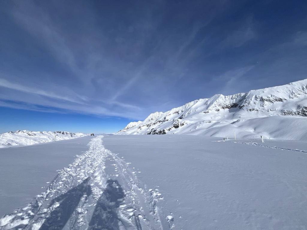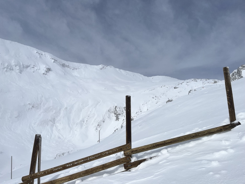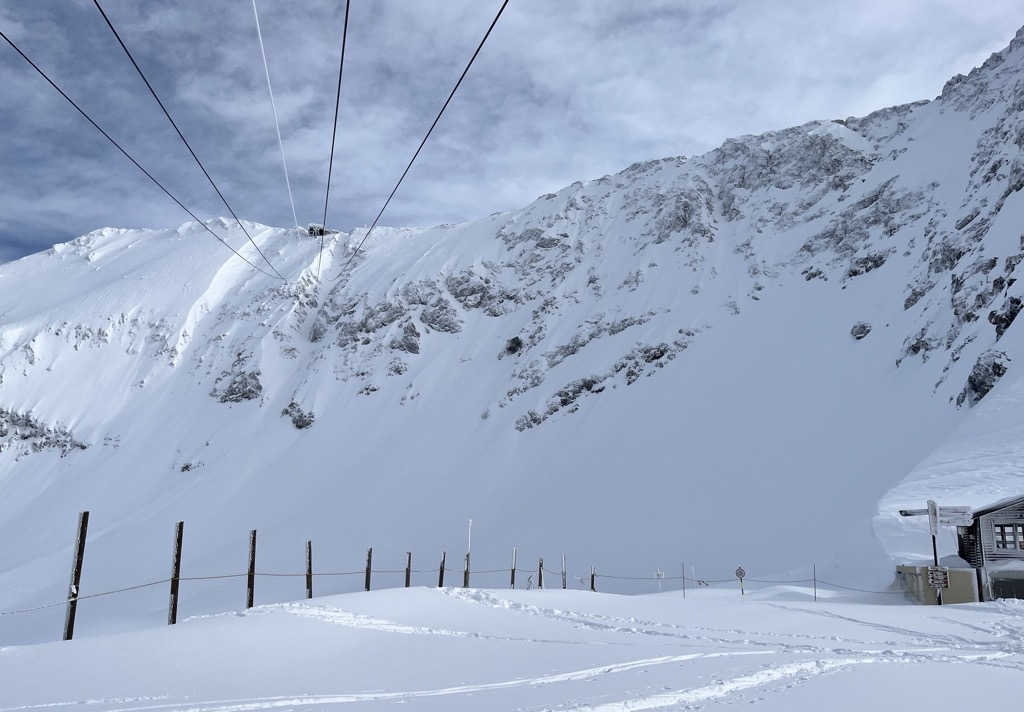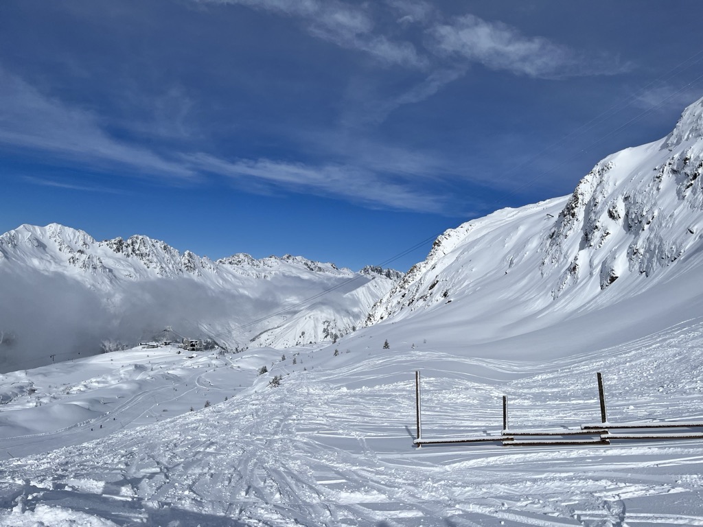Because it’s high, the snow conditions here stay soft as long as temperatures are reasonably cold. However, it is quite south-facing, so things deteriorate if it’s warm or sunny.