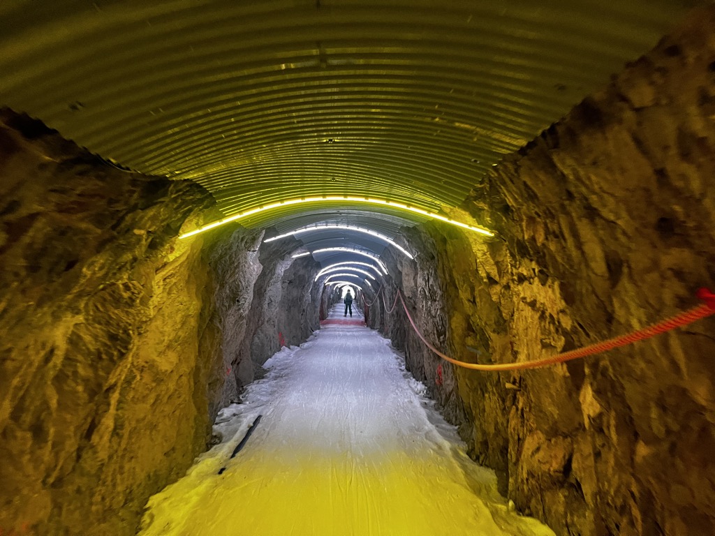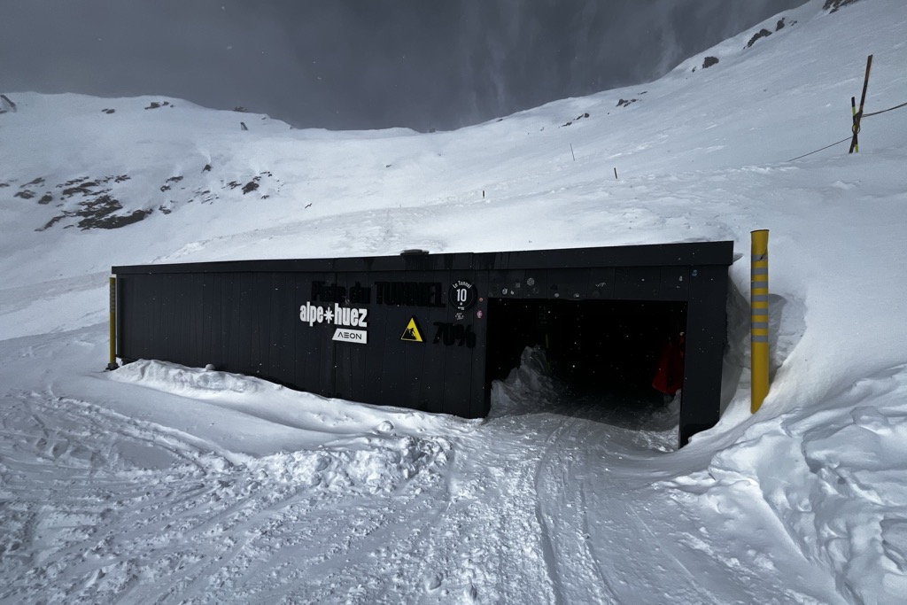 The Tunnel zone is basically the southwest face of Pic Blanc. You descend the “Glacier” piste (or off-piste) and cut through the mountain in a tunnel with a hilariously 80s vibe. It fits with the rest of Alpe d’Huez’s infrastructure: slightly outdated but superbly efficient.