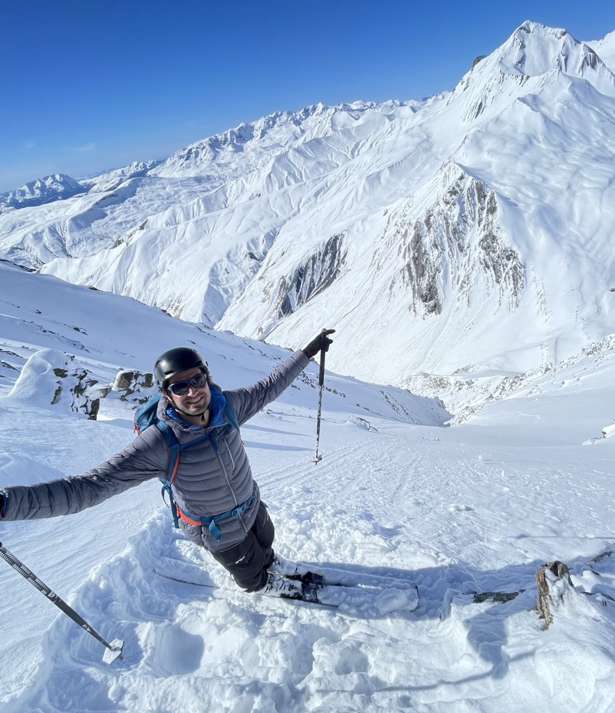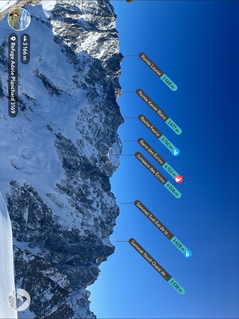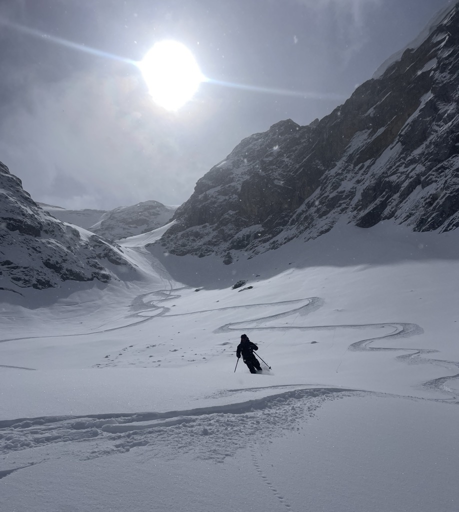 The descents from the Pic Blanc are fairly serious, and unless you know the area or are an experienced ski mountaineer, you’d be better off hiring a guide. There’s some glaciated terrain, but the primary hazards are avalanches and route-finding. My guide is just a basic introduction because I think the PeakVisor crowd will be intrigued by the possibilities. People have described the routes to me and I’ve done some scouting, but I’ve never done them, so you’ll have to seek out the details elsewhere or scout them for yourself.