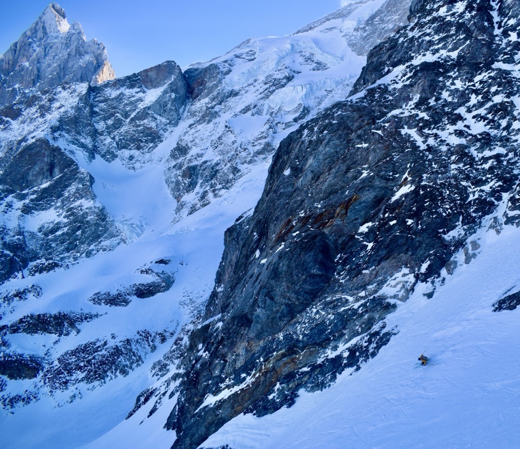 You can start anywhere along the ridge between Pic Blanc and Pic Bayle for this descent. Many people drop in right off the lift rather than navigate the ridge. However, the most aesthetic line, though more exposed, is climbing to the top of Pic Bayle and dropping in from the top of the glacier. Hang to the skier’s right to avoid cliffs.