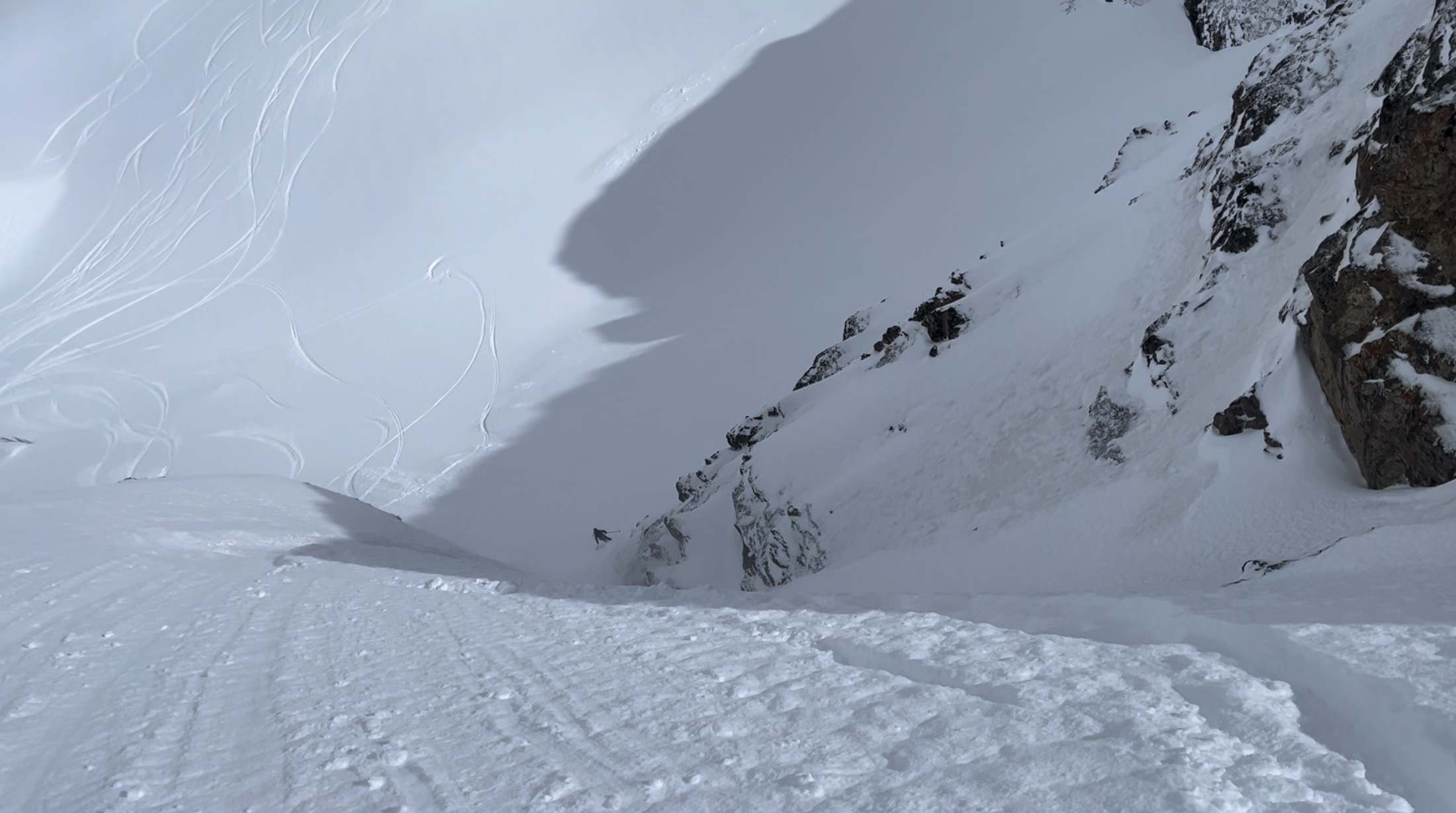 The ridge to access these descents is reasonably severe. It’s not a complete knife edge; in the right conditions, you might be able to skin most of it, but there is definitely a risk of cornice failure and avalanche.
